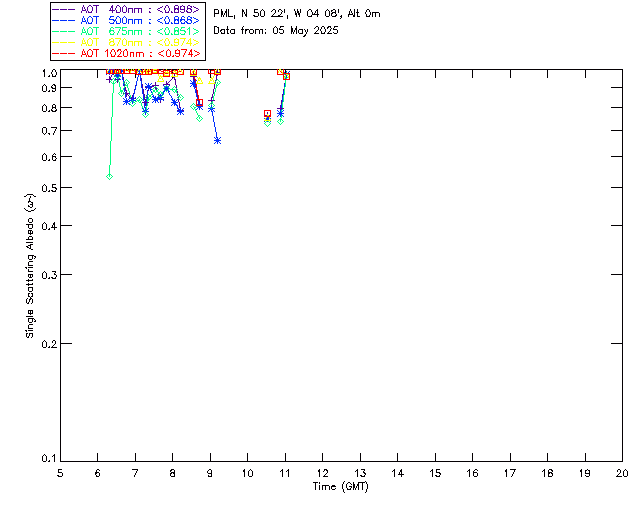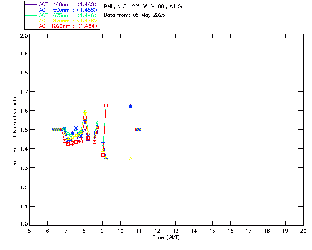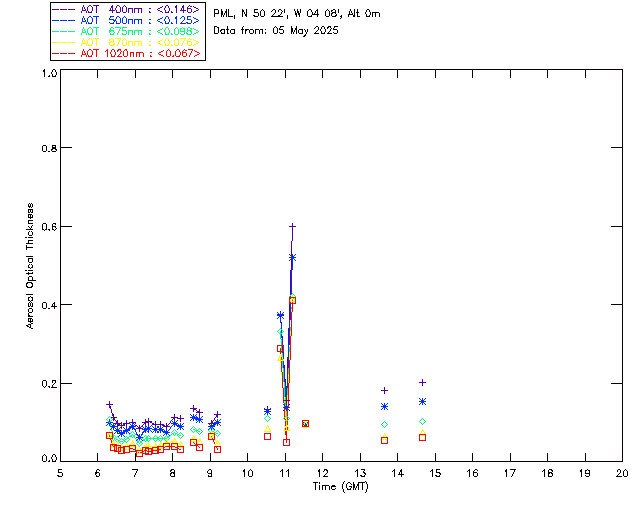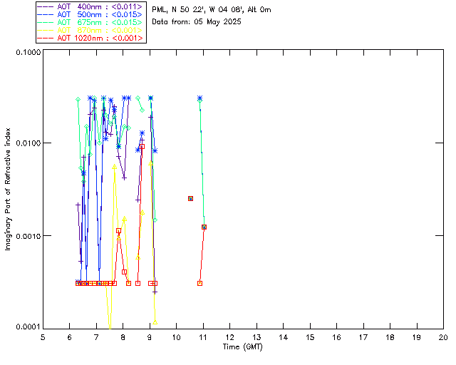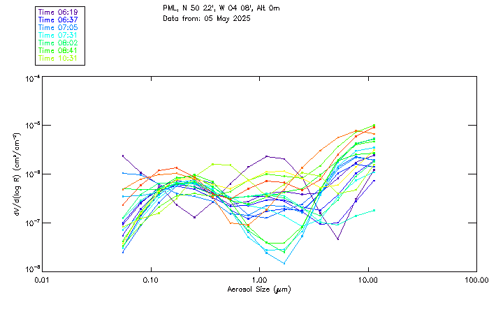 In May 2001 a PREDE POM01-L was installed on the roof of the Plymouth Marine Laboratory to continue the atmospheric correction research of the PML Remote Sensing Group. This was to replace the AERONET CIMEL sunphotometer situated at Rame Head which was decommissioned in 1999. The instrument operates at 7 wavelengths (315, 400, 500, 670, 870, 940 and 1020nm) and scans at pre-set angles away from the solar disk to determine, using the inversion code of Nakajima et al. (2006), various properties of tiny particles called aerosols within the atmospheric column. From these measurements useful atmospheric aerosol parameters such as the Aerosol Optical Thickness (AOT), aerosol size distribution and single scattering albedo can be calculated. Marine aerosols tend to be bigger (D > 1µm) than those generated over the land (0.01 < D < 1µm) and are of a different chemical composition; marine aerosols are salt particles whereas terrestrial aerosols are sulphate compounds.