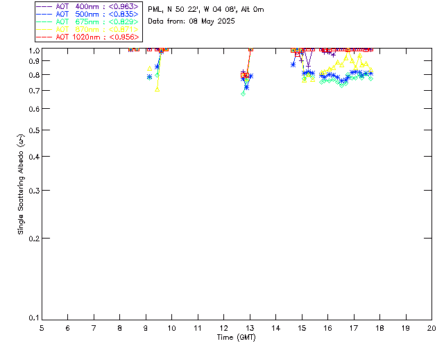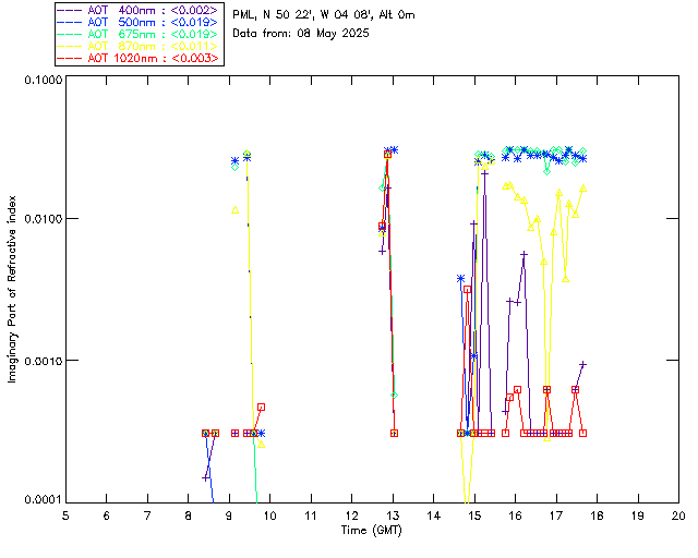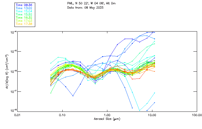 In May 2001 a PREDE POM01-L was installed on the roof of the Plymouth Marine Laboratory to continue the atmospheric correction research of the PML Remote Sensing Group. This was to replace the AERONET CIMEL sunphotometer situated at Rame Head which was decommissioned in 1999. The instrument operates at 7 wavelengths (315, 400, 500, 670, 870, 940 and 1020nm) and scans at pre-set angles away from the solar disk to determine, using the inversion code of Nakajima et al. (2006), various properties of tiny particles called aerosols within the atmospheric column. From these measurements useful atmospheric aerosol parameters such as the Aerosol Optical Thickness (AOT), aerosol size distribution and single scattering albedo can be calculated. Marine aerosols tend to be bigger (D > 1µm) than those generated over the land (0.01 < D < 1µm) and are of a different chemical composition; marine aerosols are salt particles whereas terrestrial aerosols are sulphate compounds.