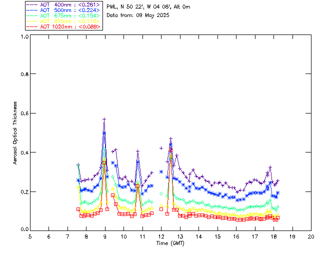 In May 2001 a PREDE POM01-L was installed on the roof of the Plymouth Marine Laboratory to continue the atmospheric correction research of the PML Remote Sensing Group. This was to replace the AERONET CIMEL sunphotometer situated at Rame Head which was decommissioned in 1999. The instrument operates at 7 wavelengths (315, 400, 500, 670, 870, 940 and 1020nm) and scans at pre-set angles away from the solar disk to determine, using the inversion code of Nakajima et al. (2006), various properties of tiny particles called aerosols within the atmospheric column. From these measurements useful atmospheric aerosol parameters such as the Aerosol Optical Thickness (AOT), aerosol size distribution and single scattering albedo can be calculated. Marine aerosols tend to be bigger (D > 1µm) than those generated over the land (0.01 < D < 1µm) and are of a different chemical composition; marine aerosols are salt particles whereas terrestrial aerosols are sulphate compounds.