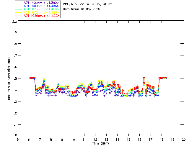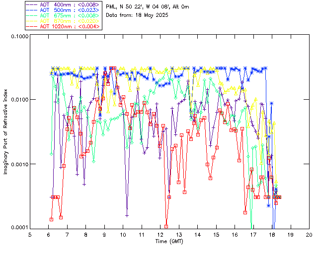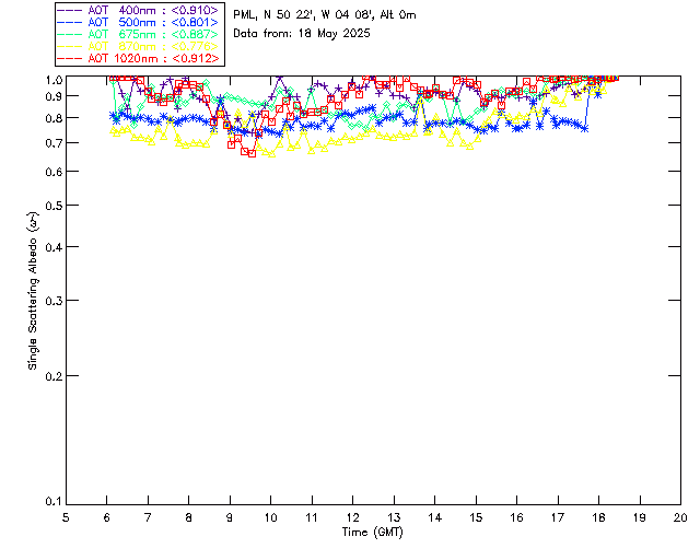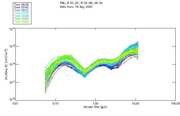 In May 2001 a PREDE POM01-L was installed on the roof of the Plymouth Marine Laboratory to continue the atmospheric correction research of the PML Remote Sensing Group. This was to replace the AERONET CIMEL sunphotometer situated at Rame Head which was decommissioned in 1999. The instrument operates at 7 wavelengths (315, 400, 500, 670, 870, 940 and 1020nm) and scans at pre-set angles away from the solar disk to determine, using the inversion code of Nakajima et al. (2006), various properties of tiny particles called aerosols within the atmospheric column. From these measurements useful atmospheric aerosol parameters such as the Aerosol Optical Thickness (AOT), aerosol size distribution and single scattering albedo can be calculated. Marine aerosols tend to be bigger (D > 1µm) than those generated over the land (0.01 < D < 1µm) and are of a different chemical composition; marine aerosols are salt particles whereas terrestrial aerosols are sulphate compounds.