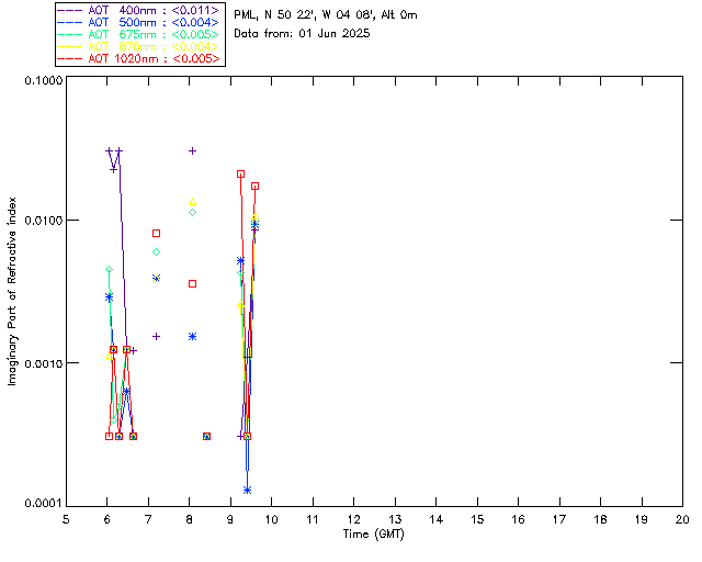 In May 2001 a PREDE POM01-L was installed on the roof of the Plymouth Marine Laboratory to continue the atmospheric correction research of the PML Remote Sensing Group. This was to replace the AERONET CIMEL sunphotometer situated at Rame Head which was decommissioned in 1999. The instrument operates at 7 wavelengths (315, 400, 500, 670, 870, 940 and 1020nm) and scans at pre-set angles away from the solar disk to determine, using the inversion code of Nakajima et al. (2006), various properties of tiny particles called aerosols within the atmospheric column. From these measurements useful atmospheric aerosol parameters such as the Aerosol Optical Thickness (AOT), aerosol size distribution and single scattering albedo can be calculated. Marine aerosols tend to be bigger (D > 1µm) than those generated over the land (0.01 < D < 1µm) and are of a different chemical composition; marine aerosols are salt particles whereas terrestrial aerosols are sulphate compounds.