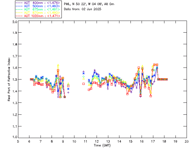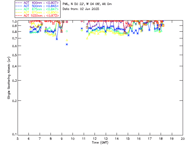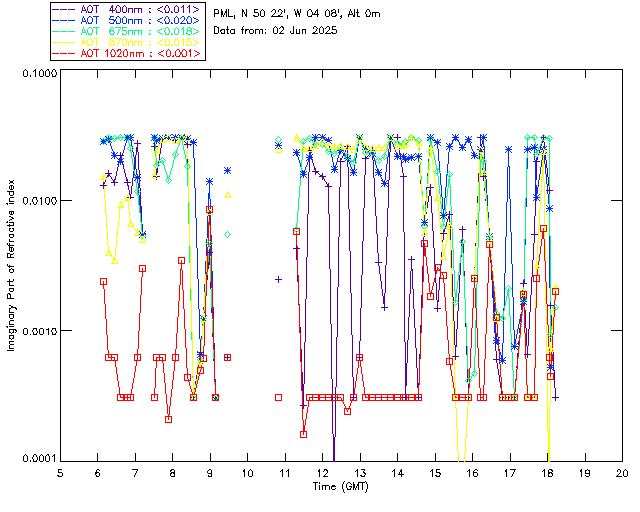 In May 2001 a PREDE POM01-L was installed on the roof of the Plymouth Marine Laboratory to continue the atmospheric correction research of the PML Remote Sensing Group. This was to replace the AERONET CIMEL sunphotometer situated at Rame Head which was decommissioned in 1999. The instrument operates at 7 wavelengths (315, 400, 500, 670, 870, 940 and 1020nm) and scans at pre-set angles away from the solar disk to determine, using the inversion code of Nakajima et al. (2006), various properties of tiny particles called aerosols within the atmospheric column. From these measurements useful atmospheric aerosol parameters such as the Aerosol Optical Thickness (AOT), aerosol size distribution and single scattering albedo can be calculated. Marine aerosols tend to be bigger (D > 1µm) than those generated over the land (0.01 < D < 1µm) and are of a different chemical composition; marine aerosols are salt particles whereas terrestrial aerosols are sulphate compounds.