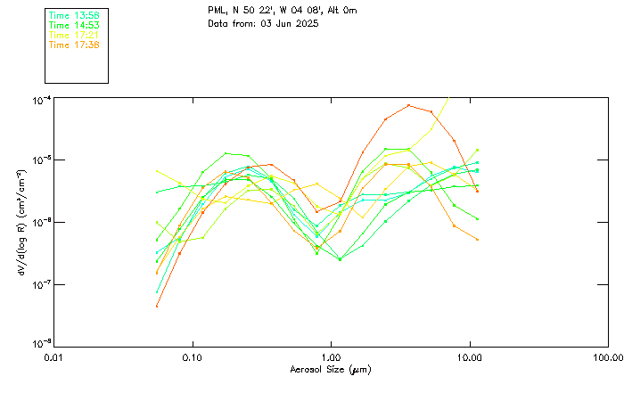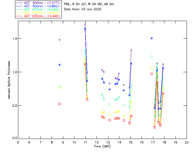 In May 2001 a PREDE POM01-L was installed on the roof of the Plymouth Marine Laboratory to continue the atmospheric correction research of the PML Remote Sensing Group. This was to replace the AERONET CIMEL sunphotometer situated at Rame Head which was decommissioned in 1999. The instrument operates at 7 wavelengths (315, 400, 500, 670, 870, 940 and 1020nm) and scans at pre-set angles away from the solar disk to determine, using the inversion code of Nakajima et al. (2006), various properties of tiny particles called aerosols within the atmospheric column. From these measurements useful atmospheric aerosol parameters such as the Aerosol Optical Thickness (AOT), aerosol size distribution and single scattering albedo can be calculated. Marine aerosols tend to be bigger (D > 1µm) than those generated over the land (0.01 < D < 1µm) and are of a different chemical composition; marine aerosols are salt particles whereas terrestrial aerosols are sulphate compounds.