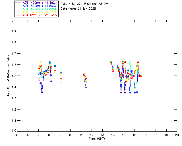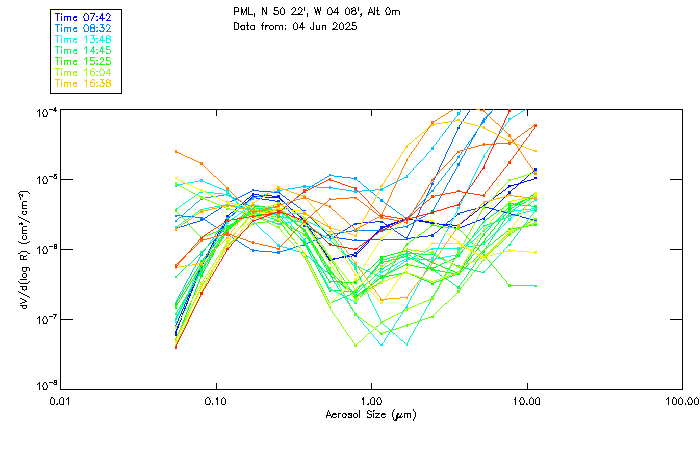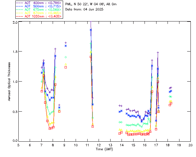 In May 2001 a PREDE POM01-L was installed on the roof of the Plymouth Marine Laboratory to continue the atmospheric correction research of the PML Remote Sensing Group. This was to replace the AERONET CIMEL sunphotometer situated at Rame Head which was decommissioned in 1999. The instrument operates at 7 wavelengths (315, 400, 500, 670, 870, 940 and 1020nm) and scans at pre-set angles away from the solar disk to determine, using the inversion code of Nakajima et al. (2006), various properties of tiny particles called aerosols within the atmospheric column. From these measurements useful atmospheric aerosol parameters such as the Aerosol Optical Thickness (AOT), aerosol size distribution and single scattering albedo can be calculated. Marine aerosols tend to be bigger (D > 1µm) than those generated over the land (0.01 < D < 1µm) and are of a different chemical composition; marine aerosols are salt particles whereas terrestrial aerosols are sulphate compounds.