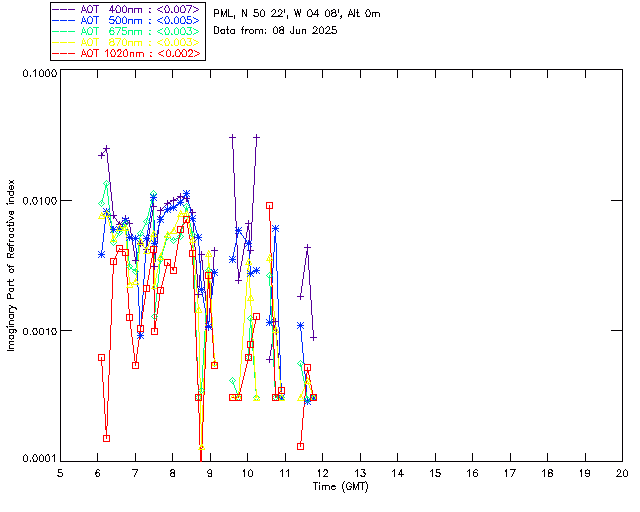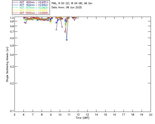 In May 2001 a PREDE POM01-L was installed on the roof of the Plymouth Marine Laboratory to continue the atmospheric correction research of the PML Remote Sensing Group. This was to replace the AERONET CIMEL sunphotometer situated at Rame Head which was decommissioned in 1999. The instrument operates at 7 wavelengths (315, 400, 500, 670, 870, 940 and 1020nm) and scans at pre-set angles away from the solar disk to determine, using the inversion code of Nakajima et al. (2006), various properties of tiny particles called aerosols within the atmospheric column. From these measurements useful atmospheric aerosol parameters such as the Aerosol Optical Thickness (AOT), aerosol size distribution and single scattering albedo can be calculated. Marine aerosols tend to be bigger (D > 1µm) than those generated over the land (0.01 < D < 1µm) and are of a different chemical composition; marine aerosols are salt particles whereas terrestrial aerosols are sulphate compounds.