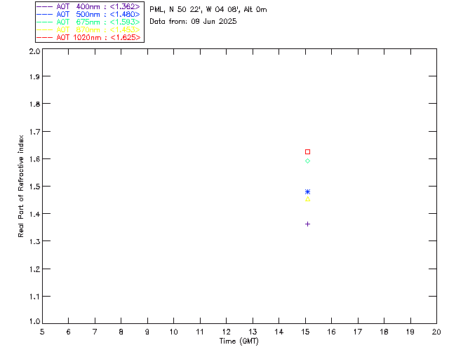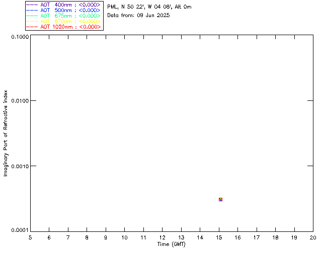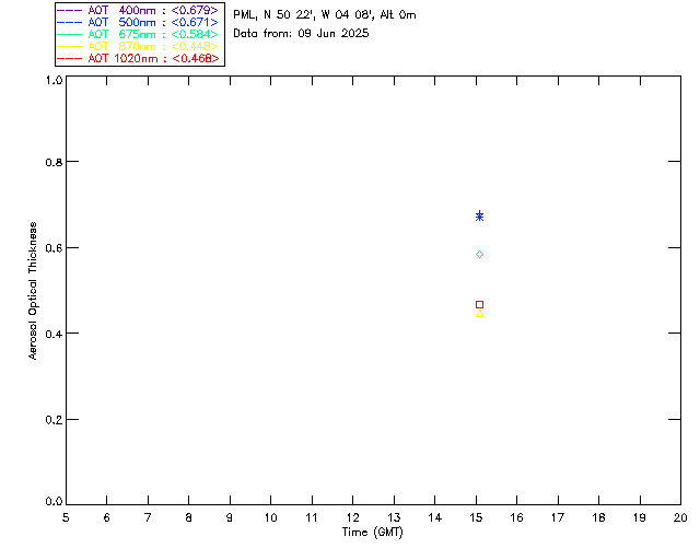 In May 2001 a PREDE POM01-L was installed on the roof of the Plymouth Marine Laboratory to continue the atmospheric correction research of the PML Remote Sensing Group. This was to replace the AERONET CIMEL sunphotometer situated at Rame Head which was decommissioned in 1999. The instrument operates at 7 wavelengths (315, 400, 500, 670, 870, 940 and 1020nm) and scans at pre-set angles away from the solar disk to determine, using the inversion code of Nakajima et al. (2006), various properties of tiny particles called aerosols within the atmospheric column. From these measurements useful atmospheric aerosol parameters such as the Aerosol Optical Thickness (AOT), aerosol size distribution and single scattering albedo can be calculated. Marine aerosols tend to be bigger (D > 1µm) than those generated over the land (0.01 < D < 1µm) and are of a different chemical composition; marine aerosols are salt particles whereas terrestrial aerosols are sulphate compounds.