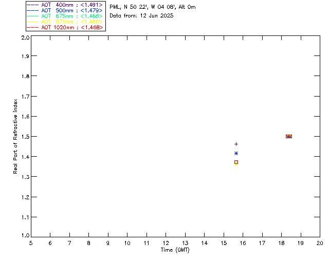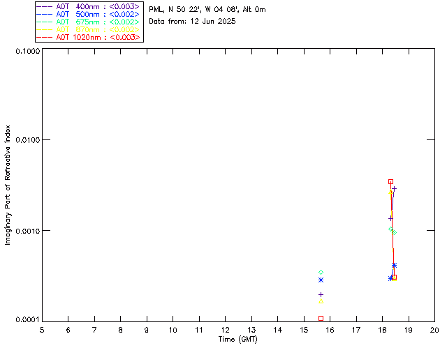 In May 2001 a PREDE POM01-L was installed on the roof of the Plymouth Marine Laboratory to continue the atmospheric correction research of the PML Remote Sensing Group. This was to replace the AERONET CIMEL sunphotometer situated at Rame Head which was decommissioned in 1999. The instrument operates at 7 wavelengths (315, 400, 500, 670, 870, 940 and 1020nm) and scans at pre-set angles away from the solar disk to determine, using the inversion code of Nakajima et al. (2006), various properties of tiny particles called aerosols within the atmospheric column. From these measurements useful atmospheric aerosol parameters such as the Aerosol Optical Thickness (AOT), aerosol size distribution and single scattering albedo can be calculated. Marine aerosols tend to be bigger (D > 1µm) than those generated over the land (0.01 < D < 1µm) and are of a different chemical composition; marine aerosols are salt particles whereas terrestrial aerosols are sulphate compounds.