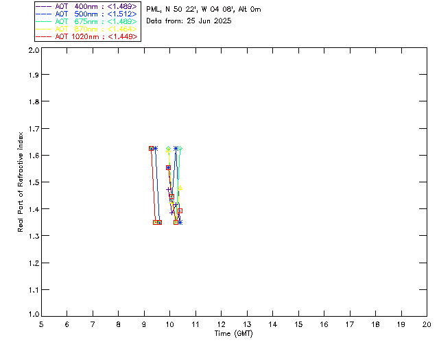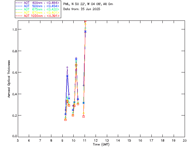 In May 2001 a PREDE POM01-L was installed on the roof of the Plymouth Marine Laboratory to continue the atmospheric correction research of the PML Remote Sensing Group. This was to replace the AERONET CIMEL sunphotometer situated at Rame Head which was decommissioned in 1999. The instrument operates at 7 wavelengths (315, 400, 500, 670, 870, 940 and 1020nm) and scans at pre-set angles away from the solar disk to determine, using the inversion code of Nakajima et al. (2006), various properties of tiny particles called aerosols within the atmospheric column. From these measurements useful atmospheric aerosol parameters such as the Aerosol Optical Thickness (AOT), aerosol size distribution and single scattering albedo can be calculated. Marine aerosols tend to be bigger (D > 1µm) than those generated over the land (0.01 < D < 1µm) and are of a different chemical composition; marine aerosols are salt particles whereas terrestrial aerosols are sulphate compounds.