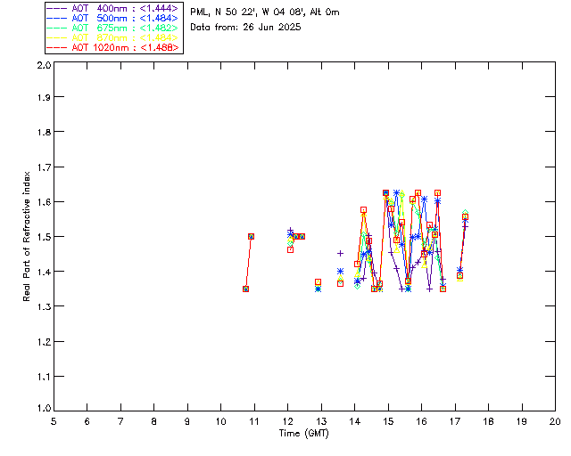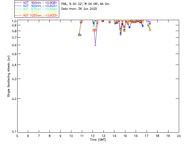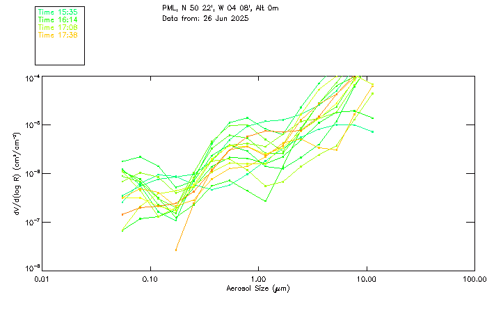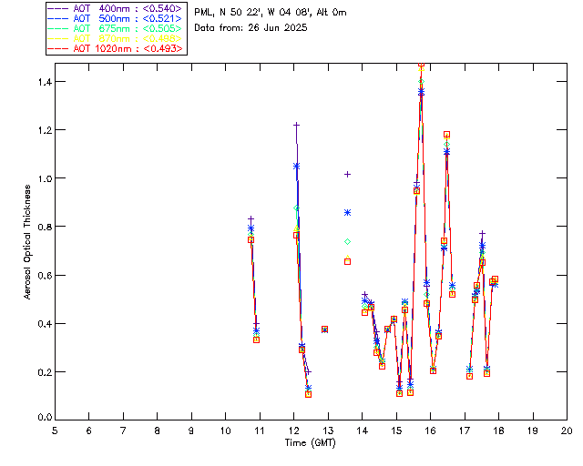 In May 2001 a PREDE POM01-L was installed on the roof of the Plymouth Marine Laboratory to continue the atmospheric correction research of the PML Remote Sensing Group. This was to replace the AERONET CIMEL sunphotometer situated at Rame Head which was decommissioned in 1999. The instrument operates at 7 wavelengths (315, 400, 500, 670, 870, 940 and 1020nm) and scans at pre-set angles away from the solar disk to determine, using the inversion code of Nakajima et al. (2006), various properties of tiny particles called aerosols within the atmospheric column. From these measurements useful atmospheric aerosol parameters such as the Aerosol Optical Thickness (AOT), aerosol size distribution and single scattering albedo can be calculated. Marine aerosols tend to be bigger (D > 1µm) than those generated over the land (0.01 < D < 1µm) and are of a different chemical composition; marine aerosols are salt particles whereas terrestrial aerosols are sulphate compounds.