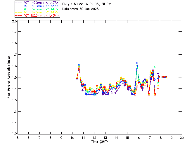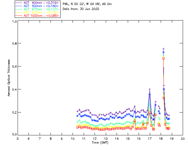 In May 2001 a PREDE POM01-L was installed on the roof of the Plymouth Marine Laboratory to continue the atmospheric correction research of the PML Remote Sensing Group. This was to replace the AERONET CIMEL sunphotometer situated at Rame Head which was decommissioned in 1999. The instrument operates at 7 wavelengths (315, 400, 500, 670, 870, 940 and 1020nm) and scans at pre-set angles away from the solar disk to determine, using the inversion code of Nakajima et al. (2006), various properties of tiny particles called aerosols within the atmospheric column. From these measurements useful atmospheric aerosol parameters such as the Aerosol Optical Thickness (AOT), aerosol size distribution and single scattering albedo can be calculated. Marine aerosols tend to be bigger (D > 1µm) than those generated over the land (0.01 < D < 1µm) and are of a different chemical composition; marine aerosols are salt particles whereas terrestrial aerosols are sulphate compounds.