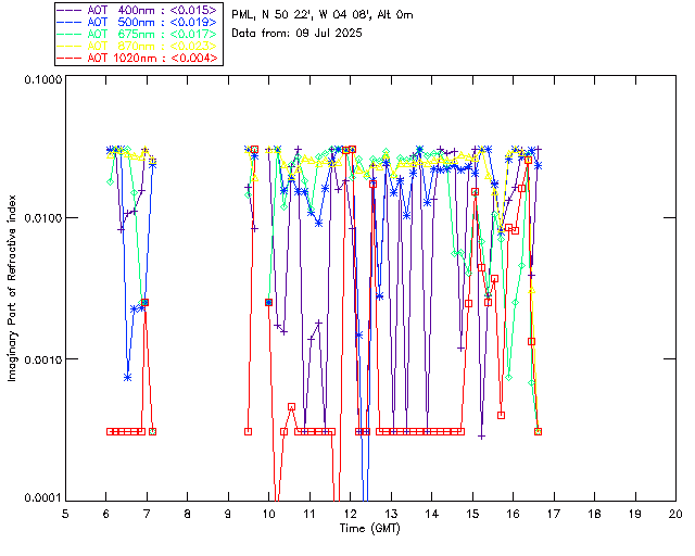 In May 2001 a PREDE POM01-L was installed on the roof of the Plymouth Marine Laboratory to continue the atmospheric correction research of the PML Remote Sensing Group. This was to replace the AERONET CIMEL sunphotometer situated at Rame Head which was decommissioned in 1999. The instrument operates at 7 wavelengths (315, 400, 500, 670, 870, 940 and 1020nm) and scans at pre-set angles away from the solar disk to determine, using the inversion code of Nakajima et al. (2006), various properties of tiny particles called aerosols within the atmospheric column. From these measurements useful atmospheric aerosol parameters such as the Aerosol Optical Thickness (AOT), aerosol size distribution and single scattering albedo can be calculated. Marine aerosols tend to be bigger (D > 1µm) than those generated over the land (0.01 < D < 1µm) and are of a different chemical composition; marine aerosols are salt particles whereas terrestrial aerosols are sulphate compounds.