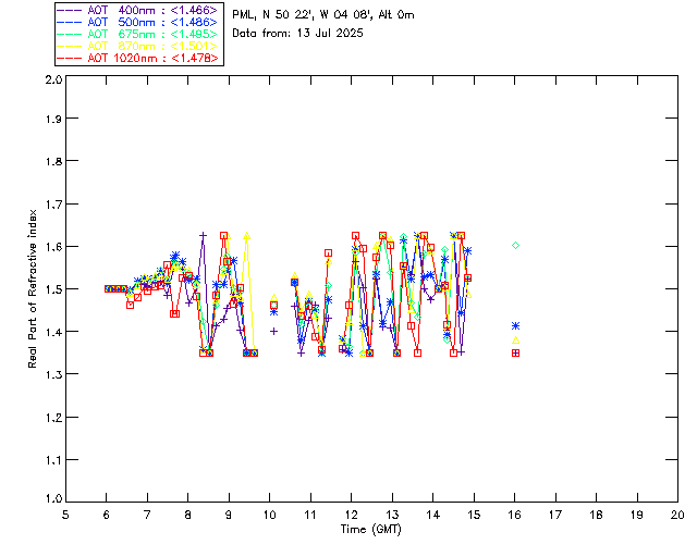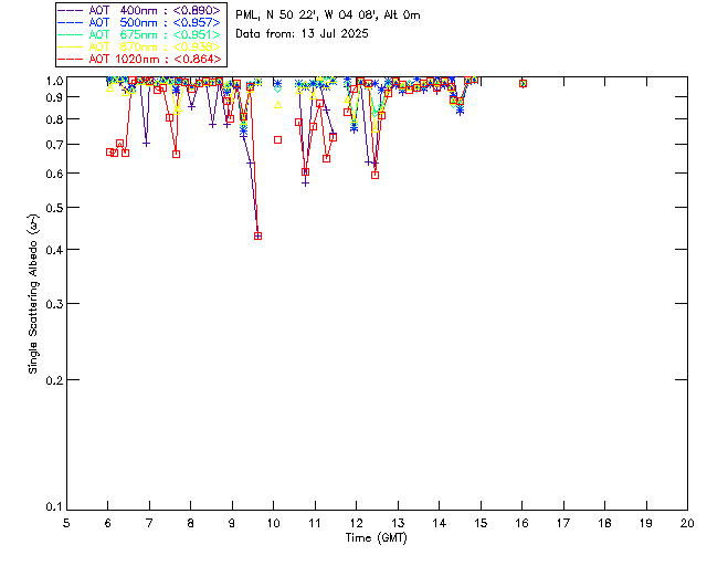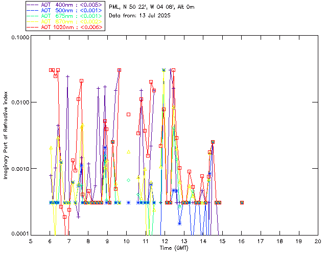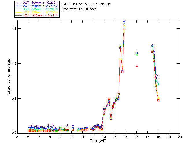 In May 2001 a PREDE POM01-L was installed on the roof of the Plymouth Marine Laboratory to continue the atmospheric correction research of the PML Remote Sensing Group. This was to replace the AERONET CIMEL sunphotometer situated at Rame Head which was decommissioned in 1999. The instrument operates at 7 wavelengths (315, 400, 500, 670, 870, 940 and 1020nm) and scans at pre-set angles away from the solar disk to determine, using the inversion code of Nakajima et al. (2006), various properties of tiny particles called aerosols within the atmospheric column. From these measurements useful atmospheric aerosol parameters such as the Aerosol Optical Thickness (AOT), aerosol size distribution and single scattering albedo can be calculated. Marine aerosols tend to be bigger (D > 1µm) than those generated over the land (0.01 < D < 1µm) and are of a different chemical composition; marine aerosols are salt particles whereas terrestrial aerosols are sulphate compounds.