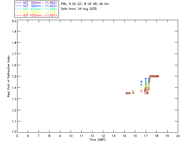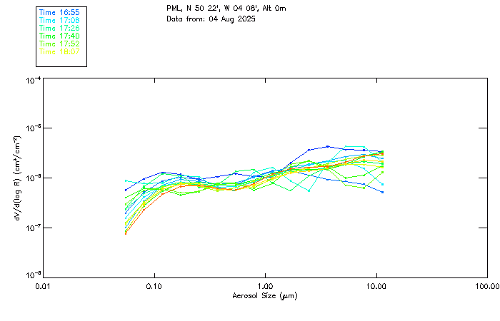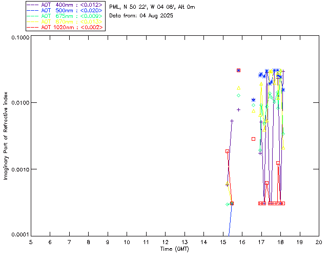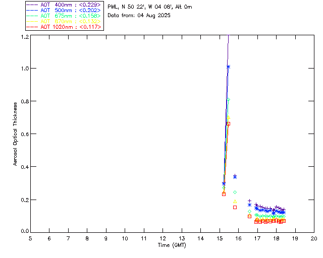 In May 2001 a PREDE POM01-L was installed on the roof of the Plymouth Marine Laboratory to continue the atmospheric correction research of the PML Remote Sensing Group. This was to replace the AERONET CIMEL sunphotometer situated at Rame Head which was decommissioned in 1999. The instrument operates at 7 wavelengths (315, 400, 500, 670, 870, 940 and 1020nm) and scans at pre-set angles away from the solar disk to determine, using the inversion code of Nakajima et al. (2006), various properties of tiny particles called aerosols within the atmospheric column. From these measurements useful atmospheric aerosol parameters such as the Aerosol Optical Thickness (AOT), aerosol size distribution and single scattering albedo can be calculated. Marine aerosols tend to be bigger (D > 1µm) than those generated over the land (0.01 < D < 1µm) and are of a different chemical composition; marine aerosols are salt particles whereas terrestrial aerosols are sulphate compounds.