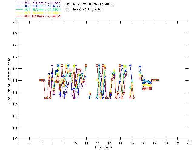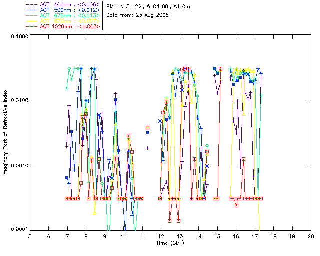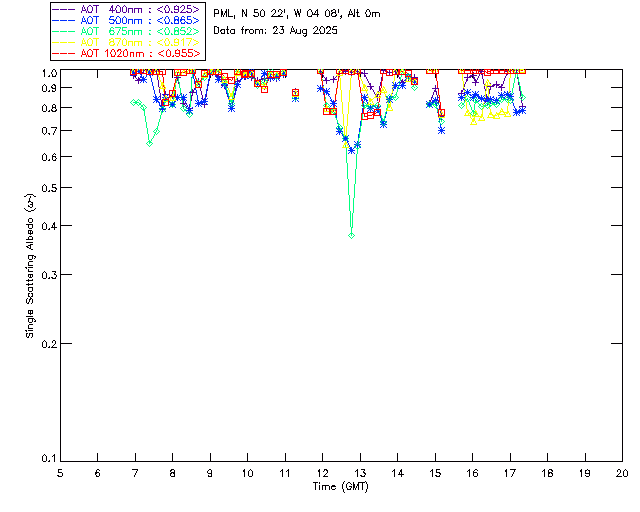 In May 2001 a PREDE POM01-L was installed on the roof of the Plymouth Marine Laboratory to continue the atmospheric correction research of the PML Remote Sensing Group. This was to replace the AERONET CIMEL sunphotometer situated at Rame Head which was decommissioned in 1999. The instrument operates at 7 wavelengths (315, 400, 500, 670, 870, 940 and 1020nm) and scans at pre-set angles away from the solar disk to determine, using the inversion code of Nakajima et al. (2006), various properties of tiny particles called aerosols within the atmospheric column. From these measurements useful atmospheric aerosol parameters such as the Aerosol Optical Thickness (AOT), aerosol size distribution and single scattering albedo can be calculated. Marine aerosols tend to be bigger (D > 1µm) than those generated over the land (0.01 < D < 1µm) and are of a different chemical composition; marine aerosols are salt particles whereas terrestrial aerosols are sulphate compounds.
