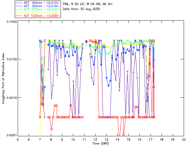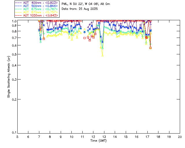 In May 2001 a PREDE POM01-L was installed on the roof of the Plymouth Marine Laboratory to continue the atmospheric correction research of the PML Remote Sensing Group. This was to replace the AERONET CIMEL sunphotometer situated at Rame Head which was decommissioned in 1999. The instrument operates at 7 wavelengths (315, 400, 500, 670, 870, 940 and 1020nm) and scans at pre-set angles away from the solar disk to determine, using the inversion code of Nakajima et al. (2006), various properties of tiny particles called aerosols within the atmospheric column. From these measurements useful atmospheric aerosol parameters such as the Aerosol Optical Thickness (AOT), aerosol size distribution and single scattering albedo can be calculated. Marine aerosols tend to be bigger (D > 1µm) than those generated over the land (0.01 < D < 1µm) and are of a different chemical composition; marine aerosols are salt particles whereas terrestrial aerosols are sulphate compounds.