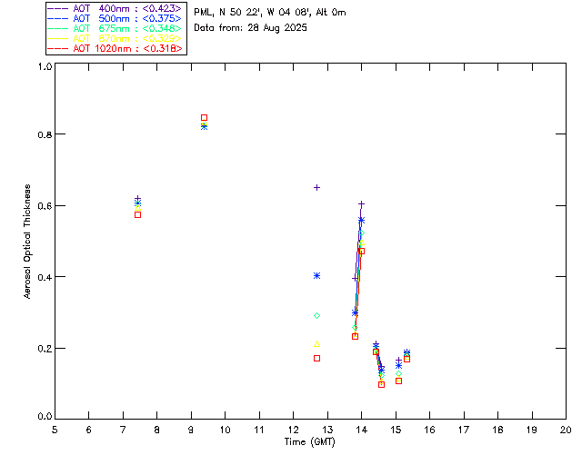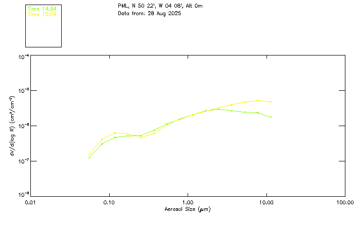 In May 2001 a PREDE POM01-L was installed on the roof of the Plymouth Marine Laboratory to continue the atmospheric correction research of the PML Remote Sensing Group. This was to replace the AERONET CIMEL sunphotometer situated at Rame Head which was decommissioned in 1999. The instrument operates at 7 wavelengths (315, 400, 500, 670, 870, 940 and 1020nm) and scans at pre-set angles away from the solar disk to determine, using the inversion code of Nakajima et al. (2006), various properties of tiny particles called aerosols within the atmospheric column. From these measurements useful atmospheric aerosol parameters such as the Aerosol Optical Thickness (AOT), aerosol size distribution and single scattering albedo can be calculated. Marine aerosols tend to be bigger (D > 1µm) than those generated over the land (0.01 < D < 1µm) and are of a different chemical composition; marine aerosols are salt particles whereas terrestrial aerosols are sulphate compounds.