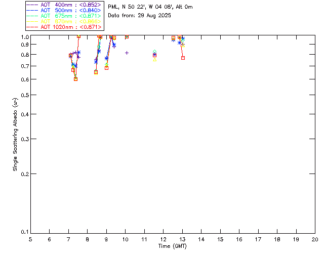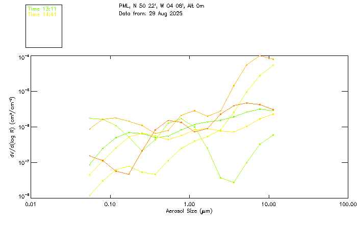 In May 2001 a PREDE POM01-L was installed on the roof of the Plymouth Marine Laboratory to continue the atmospheric correction research of the PML Remote Sensing Group. This was to replace the AERONET CIMEL sunphotometer situated at Rame Head which was decommissioned in 1999. The instrument operates at 7 wavelengths (315, 400, 500, 670, 870, 940 and 1020nm) and scans at pre-set angles away from the solar disk to determine, using the inversion code of Nakajima et al. (2006), various properties of tiny particles called aerosols within the atmospheric column. From these measurements useful atmospheric aerosol parameters such as the Aerosol Optical Thickness (AOT), aerosol size distribution and single scattering albedo can be calculated. Marine aerosols tend to be bigger (D > 1µm) than those generated over the land (0.01 < D < 1µm) and are of a different chemical composition; marine aerosols are salt particles whereas terrestrial aerosols are sulphate compounds.
