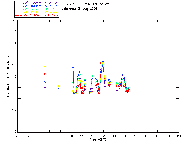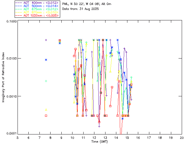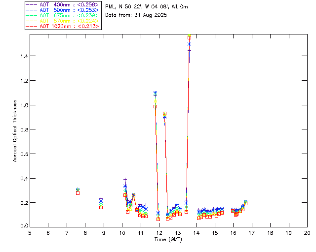 In May 2001 a PREDE POM01-L was installed on the roof of the Plymouth Marine Laboratory to continue the atmospheric correction research of the PML Remote Sensing Group. This was to replace the AERONET CIMEL sunphotometer situated at Rame Head which was decommissioned in 1999. The instrument operates at 7 wavelengths (315, 400, 500, 670, 870, 940 and 1020nm) and scans at pre-set angles away from the solar disk to determine, using the inversion code of Nakajima et al. (2006), various properties of tiny particles called aerosols within the atmospheric column. From these measurements useful atmospheric aerosol parameters such as the Aerosol Optical Thickness (AOT), aerosol size distribution and single scattering albedo can be calculated. Marine aerosols tend to be bigger (D > 1µm) than those generated over the land (0.01 < D < 1µm) and are of a different chemical composition; marine aerosols are salt particles whereas terrestrial aerosols are sulphate compounds.