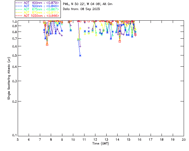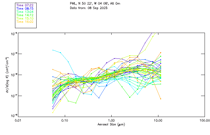 In May 2001 a PREDE POM01-L was installed on the roof of the Plymouth Marine Laboratory to continue the atmospheric correction research of the PML Remote Sensing Group. This was to replace the AERONET CIMEL sunphotometer situated at Rame Head which was decommissioned in 1999. The instrument operates at 7 wavelengths (315, 400, 500, 670, 870, 940 and 1020nm) and scans at pre-set angles away from the solar disk to determine, using the inversion code of Nakajima et al. (2006), various properties of tiny particles called aerosols within the atmospheric column. From these measurements useful atmospheric aerosol parameters such as the Aerosol Optical Thickness (AOT), aerosol size distribution and single scattering albedo can be calculated. Marine aerosols tend to be bigger (D > 1µm) than those generated over the land (0.01 < D < 1µm) and are of a different chemical composition; marine aerosols are salt particles whereas terrestrial aerosols are sulphate compounds.