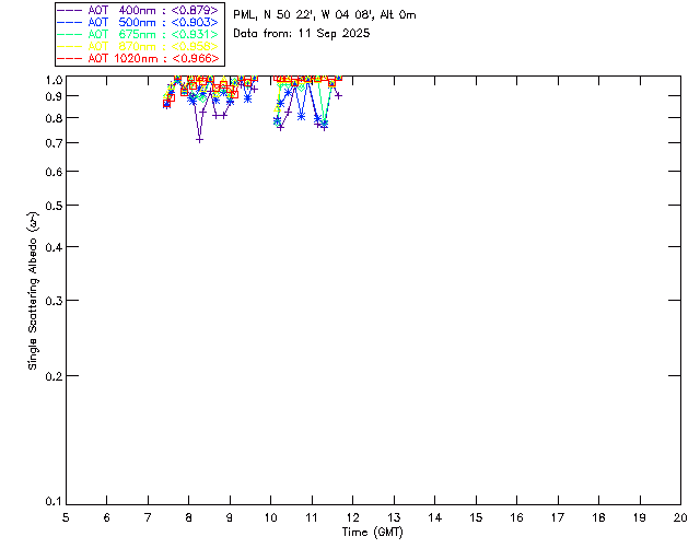 In May 2001 a PREDE POM01-L was installed on the roof of the Plymouth Marine Laboratory to continue the atmospheric correction research of the PML Remote Sensing Group. This was to replace the AERONET CIMEL sunphotometer situated at Rame Head which was decommissioned in 1999. The instrument operates at 7 wavelengths (315, 400, 500, 670, 870, 940 and 1020nm) and scans at pre-set angles away from the solar disk to determine, using the inversion code of Nakajima et al. (2006), various properties of tiny particles called aerosols within the atmospheric column. From these measurements useful atmospheric aerosol parameters such as the Aerosol Optical Thickness (AOT), aerosol size distribution and single scattering albedo can be calculated. Marine aerosols tend to be bigger (D > 1µm) than those generated over the land (0.01 < D < 1µm) and are of a different chemical composition; marine aerosols are salt particles whereas terrestrial aerosols are sulphate compounds.
