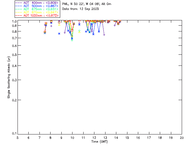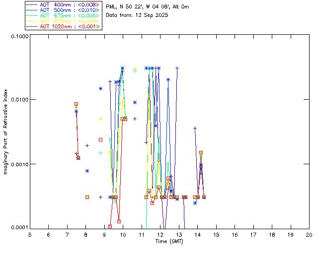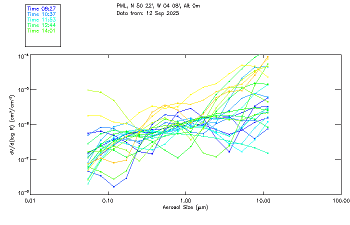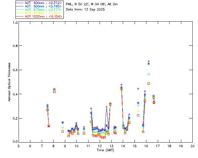 In May 2001 a PREDE POM01-L was installed on the roof of the Plymouth Marine Laboratory to continue the atmospheric correction research of the PML Remote Sensing Group. This was to replace the AERONET CIMEL sunphotometer situated at Rame Head which was decommissioned in 1999. The instrument operates at 7 wavelengths (315, 400, 500, 670, 870, 940 and 1020nm) and scans at pre-set angles away from the solar disk to determine, using the inversion code of Nakajima et al. (2006), various properties of tiny particles called aerosols within the atmospheric column. From these measurements useful atmospheric aerosol parameters such as the Aerosol Optical Thickness (AOT), aerosol size distribution and single scattering albedo can be calculated. Marine aerosols tend to be bigger (D > 1µm) than those generated over the land (0.01 < D < 1µm) and are of a different chemical composition; marine aerosols are salt particles whereas terrestrial aerosols are sulphate compounds.