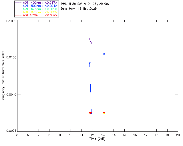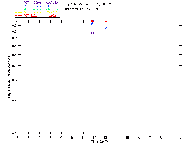 In May 2001 a PREDE POM01-L was installed on the roof of the Plymouth Marine Laboratory to continue the atmospheric correction research of the PML Remote Sensing Group. This was to replace the AERONET CIMEL sunphotometer situated at Rame Head which was decommissioned in 1999. The instrument operates at 7 wavelengths (315, 400, 500, 670, 870, 940 and 1020nm) and scans at pre-set angles away from the solar disk to determine, using the inversion code of Nakajima et al. (2006), various properties of tiny particles called aerosols within the atmospheric column. From these measurements useful atmospheric aerosol parameters such as the Aerosol Optical Thickness (AOT), aerosol size distribution and single scattering albedo can be calculated. Marine aerosols tend to be bigger (D > 1µm) than those generated over the land (0.01 < D < 1µm) and are of a different chemical composition; marine aerosols are salt particles whereas terrestrial aerosols are sulphate compounds.