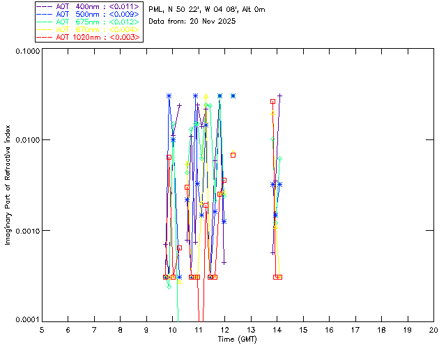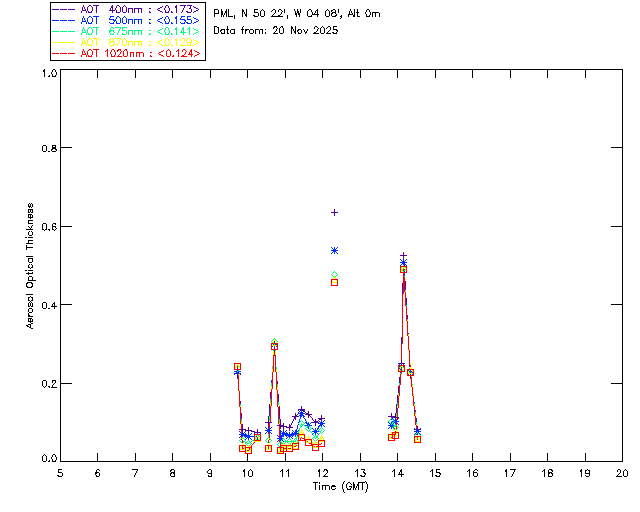 In May 2001 a PREDE POM01-L was installed on the roof of the Plymouth Marine Laboratory to continue the atmospheric correction research of the PML Remote Sensing Group. This was to replace the AERONET CIMEL sunphotometer situated at Rame Head which was decommissioned in 1999. The instrument operates at 7 wavelengths (315, 400, 500, 670, 870, 940 and 1020nm) and scans at pre-set angles away from the solar disk to determine, using the inversion code of Nakajima et al. (2006), various properties of tiny particles called aerosols within the atmospheric column. From these measurements useful atmospheric aerosol parameters such as the Aerosol Optical Thickness (AOT), aerosol size distribution and single scattering albedo can be calculated. Marine aerosols tend to be bigger (D > 1µm) than those generated over the land (0.01 < D < 1µm) and are of a different chemical composition; marine aerosols are salt particles whereas terrestrial aerosols are sulphate compounds.