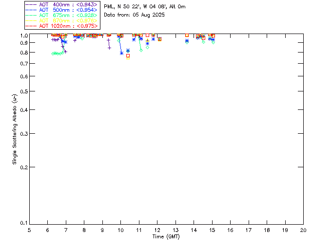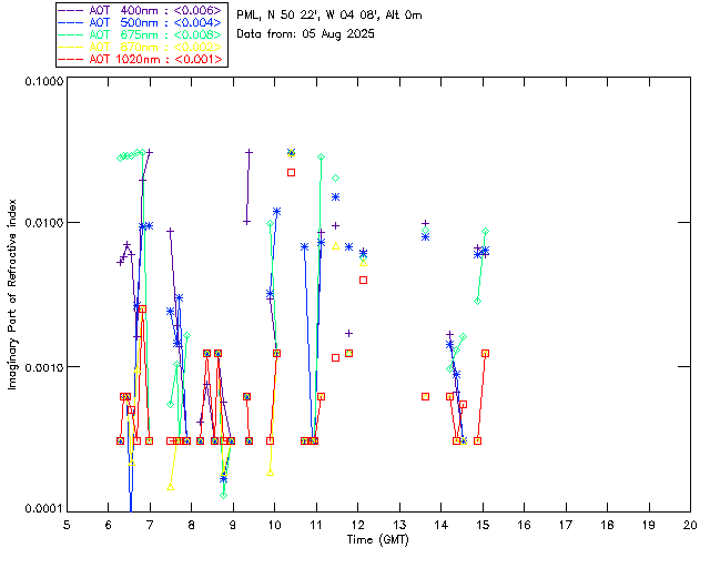 In May 2001 a PREDE POM01-L was installed on the roof of the Plymouth Marine Laboratory to continue the atmospheric correction research of the PML Remote Sensing Group. This was to replace the AERONET CIMEL sunphotometer situated at Rame Head which was decommissioned in 1999. The instrument operates at 7 wavelengths (315, 400, 500, 670, 870, 940 and 1020nm) and scans at pre-set angles away from the solar disk to determine, using the inversion code of Nakajima et al. (2006), various properties of tiny particles called aerosols within the atmospheric column. From these measurements useful atmospheric aerosol parameters such as the Aerosol Optical Thickness (AOT), aerosol size distribution and single scattering albedo can be calculated. Marine aerosols tend to be bigger (D > 1µm) than those generated over the land (0.01 < D < 1µm) and are of a different chemical composition; marine aerosols are salt particles whereas terrestrial aerosols are sulphate compounds.
