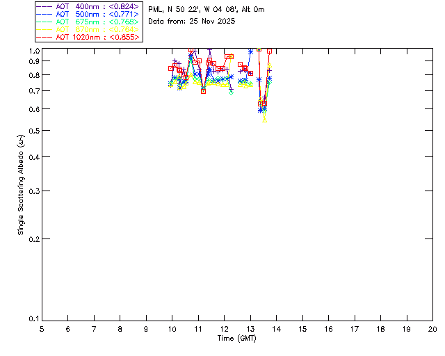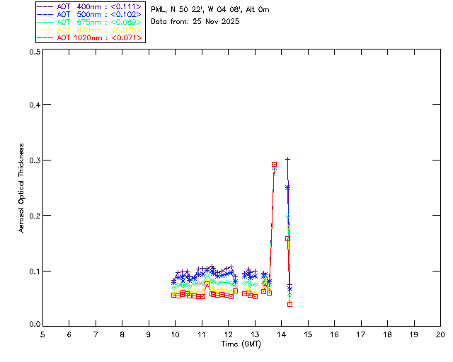 In May 2001 a PREDE POM01-L was installed on the roof of the Plymouth Marine Laboratory to continue the atmospheric correction research of the PML Remote Sensing Group. This was to replace the AERONET CIMEL sunphotometer situated at Rame Head which was decommissioned in 1999. The instrument operates at 7 wavelengths (315, 400, 500, 670, 870, 940 and 1020nm) and scans at pre-set angles away from the solar disk to determine, using the inversion code of Nakajima et al. (2006), various properties of tiny particles called aerosols within the atmospheric column. From these measurements useful atmospheric aerosol parameters such as the Aerosol Optical Thickness (AOT), aerosol size distribution and single scattering albedo can be calculated. Marine aerosols tend to be bigger (D > 1µm) than those generated over the land (0.01 < D < 1µm) and are of a different chemical composition; marine aerosols are salt particles whereas terrestrial aerosols are sulphate compounds.