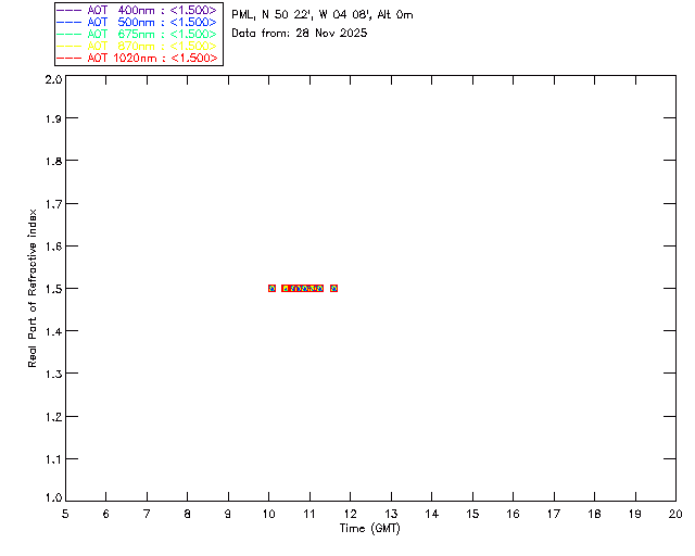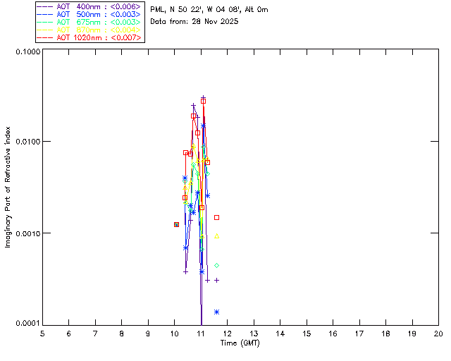 In May 2001 a PREDE POM01-L was installed on the roof of the Plymouth Marine Laboratory to continue the atmospheric correction research of the PML Remote Sensing Group. This was to replace the AERONET CIMEL sunphotometer situated at Rame Head which was decommissioned in 1999. The instrument operates at 7 wavelengths (315, 400, 500, 670, 870, 940 and 1020nm) and scans at pre-set angles away from the solar disk to determine, using the inversion code of Nakajima et al. (2006), various properties of tiny particles called aerosols within the atmospheric column. From these measurements useful atmospheric aerosol parameters such as the Aerosol Optical Thickness (AOT), aerosol size distribution and single scattering albedo can be calculated. Marine aerosols tend to be bigger (D > 1µm) than those generated over the land (0.01 < D < 1µm) and are of a different chemical composition; marine aerosols are salt particles whereas terrestrial aerosols are sulphate compounds.