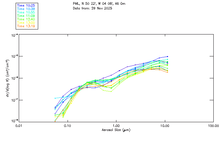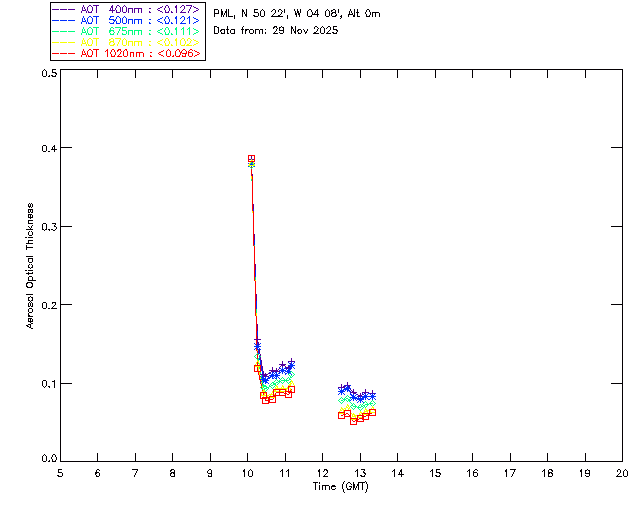 In May 2001 a PREDE POM01-L was installed on the roof of the Plymouth Marine Laboratory to continue the atmospheric correction research of the PML Remote Sensing Group. This was to replace the AERONET CIMEL sunphotometer situated at Rame Head which was decommissioned in 1999. The instrument operates at 7 wavelengths (315, 400, 500, 670, 870, 940 and 1020nm) and scans at pre-set angles away from the solar disk to determine, using the inversion code of Nakajima et al. (2006), various properties of tiny particles called aerosols within the atmospheric column. From these measurements useful atmospheric aerosol parameters such as the Aerosol Optical Thickness (AOT), aerosol size distribution and single scattering albedo can be calculated. Marine aerosols tend to be bigger (D > 1µm) than those generated over the land (0.01 < D < 1µm) and are of a different chemical composition; marine aerosols are salt particles whereas terrestrial aerosols are sulphate compounds.