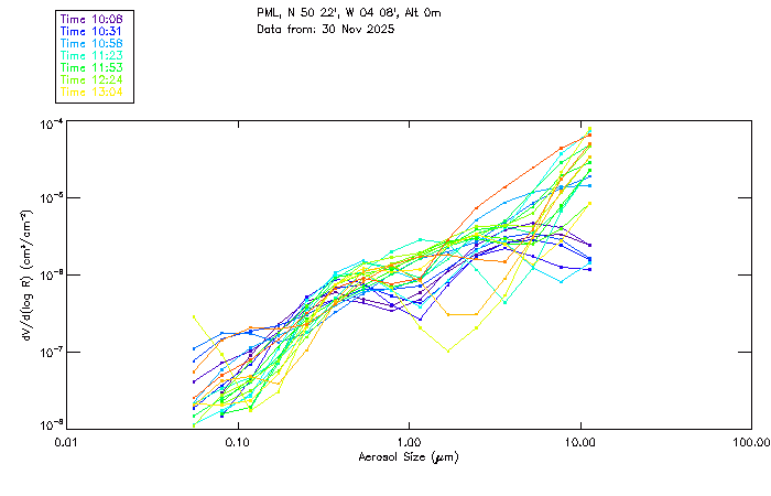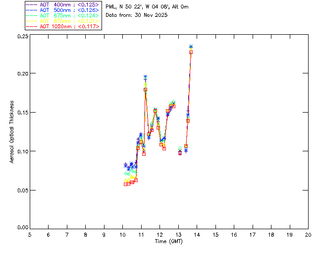 In May 2001 a PREDE POM01-L was installed on the roof of the Plymouth Marine Laboratory to continue the atmospheric correction research of the PML Remote Sensing Group. This was to replace the AERONET CIMEL sunphotometer situated at Rame Head which was decommissioned in 1999. The instrument operates at 7 wavelengths (315, 400, 500, 670, 870, 940 and 1020nm) and scans at pre-set angles away from the solar disk to determine, using the inversion code of Nakajima et al. (2006), various properties of tiny particles called aerosols within the atmospheric column. From these measurements useful atmospheric aerosol parameters such as the Aerosol Optical Thickness (AOT), aerosol size distribution and single scattering albedo can be calculated. Marine aerosols tend to be bigger (D > 1µm) than those generated over the land (0.01 < D < 1µm) and are of a different chemical composition; marine aerosols are salt particles whereas terrestrial aerosols are sulphate compounds.
