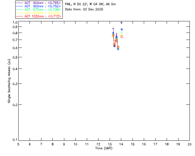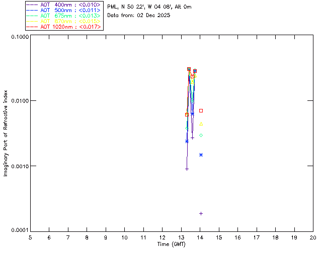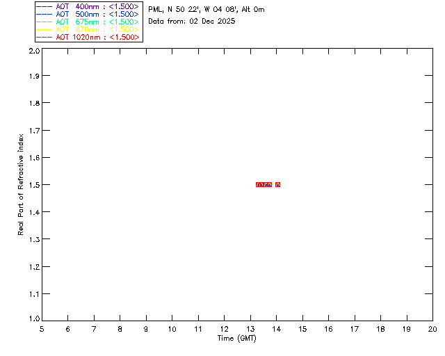 In May 2001 a PREDE POM01-L was installed on the roof of the Plymouth Marine Laboratory to continue the atmospheric correction research of the PML Remote Sensing Group. This was to replace the AERONET CIMEL sunphotometer situated at Rame Head which was decommissioned in 1999. The instrument operates at 7 wavelengths (315, 400, 500, 670, 870, 940 and 1020nm) and scans at pre-set angles away from the solar disk to determine, using the inversion code of Nakajima et al. (2006), various properties of tiny particles called aerosols within the atmospheric column. From these measurements useful atmospheric aerosol parameters such as the Aerosol Optical Thickness (AOT), aerosol size distribution and single scattering albedo can be calculated. Marine aerosols tend to be bigger (D > 1µm) than those generated over the land (0.01 < D < 1µm) and are of a different chemical composition; marine aerosols are salt particles whereas terrestrial aerosols are sulphate compounds.