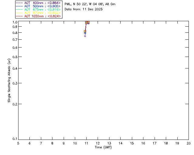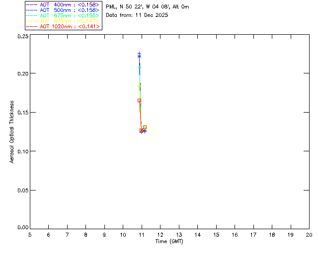 In May 2001 a PREDE POM01-L was installed on the roof of the Plymouth Marine Laboratory to continue the atmospheric correction research of the PML Remote Sensing Group. This was to replace the AERONET CIMEL sunphotometer situated at Rame Head which was decommissioned in 1999. The instrument operates at 7 wavelengths (315, 400, 500, 670, 870, 940 and 1020nm) and scans at pre-set angles away from the solar disk to determine, using the inversion code of Nakajima et al. (2006), various properties of tiny particles called aerosols within the atmospheric column. From these measurements useful atmospheric aerosol parameters such as the Aerosol Optical Thickness (AOT), aerosol size distribution and single scattering albedo can be calculated. Marine aerosols tend to be bigger (D > 1µm) than those generated over the land (0.01 < D < 1µm) and are of a different chemical composition; marine aerosols are salt particles whereas terrestrial aerosols are sulphate compounds.