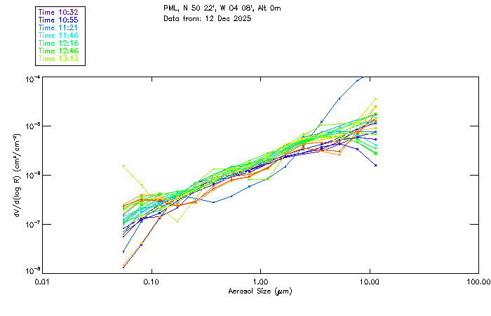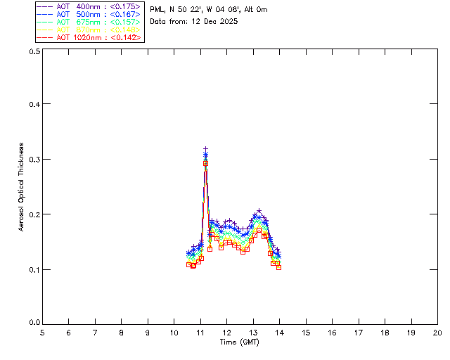 In May 2001 a PREDE POM01-L was installed on the roof of the Plymouth Marine Laboratory to continue the atmospheric correction research of the PML Remote Sensing Group. This was to replace the AERONET CIMEL sunphotometer situated at Rame Head which was decommissioned in 1999. The instrument operates at 7 wavelengths (315, 400, 500, 670, 870, 940 and 1020nm) and scans at pre-set angles away from the solar disk to determine, using the inversion code of Nakajima et al. (2006), various properties of tiny particles called aerosols within the atmospheric column. From these measurements useful atmospheric aerosol parameters such as the Aerosol Optical Thickness (AOT), aerosol size distribution and single scattering albedo can be calculated. Marine aerosols tend to be bigger (D > 1µm) than those generated over the land (0.01 < D < 1µm) and are of a different chemical composition; marine aerosols are salt particles whereas terrestrial aerosols are sulphate compounds.