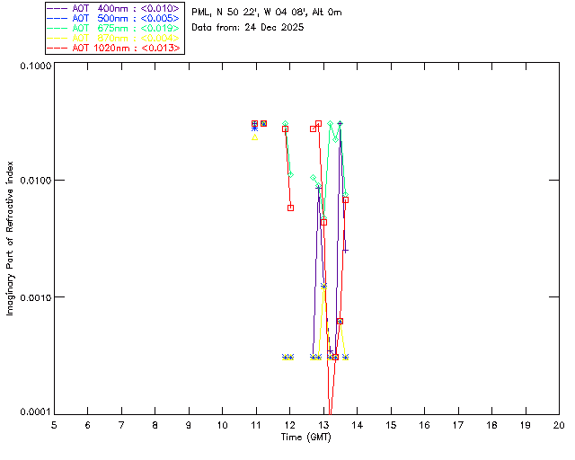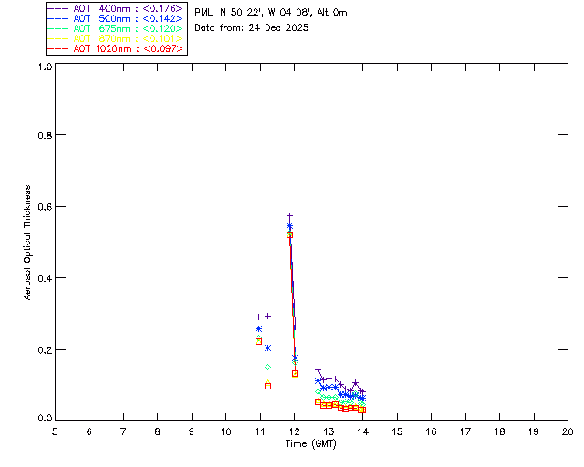 In May 2001 a PREDE POM01-L was installed on the roof of the Plymouth Marine Laboratory to continue the atmospheric correction research of the PML Remote Sensing Group. This was to replace the AERONET CIMEL sunphotometer situated at Rame Head which was decommissioned in 1999. The instrument operates at 7 wavelengths (315, 400, 500, 670, 870, 940 and 1020nm) and scans at pre-set angles away from the solar disk to determine, using the inversion code of Nakajima et al. (2006), various properties of tiny particles called aerosols within the atmospheric column. From these measurements useful atmospheric aerosol parameters such as the Aerosol Optical Thickness (AOT), aerosol size distribution and single scattering albedo can be calculated. Marine aerosols tend to be bigger (D > 1µm) than those generated over the land (0.01 < D < 1µm) and are of a different chemical composition; marine aerosols are salt particles whereas terrestrial aerosols are sulphate compounds.