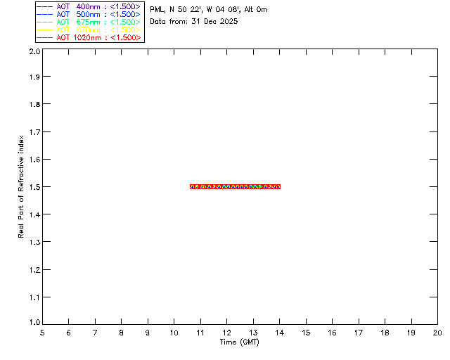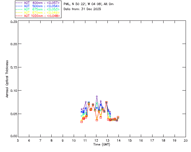 In May 2001 a PREDE POM01-L was installed on the roof of the Plymouth Marine Laboratory to continue the atmospheric correction research of the PML Remote Sensing Group. This was to replace the AERONET CIMEL sunphotometer situated at Rame Head which was decommissioned in 1999. The instrument operates at 7 wavelengths (315, 400, 500, 670, 870, 940 and 1020nm) and scans at pre-set angles away from the solar disk to determine, using the inversion code of Nakajima et al. (2006), various properties of tiny particles called aerosols within the atmospheric column. From these measurements useful atmospheric aerosol parameters such as the Aerosol Optical Thickness (AOT), aerosol size distribution and single scattering albedo can be calculated. Marine aerosols tend to be bigger (D > 1µm) than those generated over the land (0.01 < D < 1µm) and are of a different chemical composition; marine aerosols are salt particles whereas terrestrial aerosols are sulphate compounds.