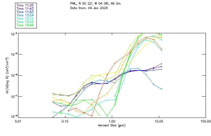 In May 2001 a PREDE POM01-L was installed on the roof of the Plymouth Marine Laboratory to continue the atmospheric correction research of the PML Remote Sensing Group. This was to replace the AERONET CIMEL sunphotometer situated at Rame Head which was decommissioned in 1999. The instrument operates at 7 wavelengths (315, 400, 500, 670, 870, 940 and 1020nm) and scans at pre-set angles away from the solar disk to determine, using the inversion code of Nakajima et al. (2006), various properties of tiny particles called aerosols within the atmospheric column. From these measurements useful atmospheric aerosol parameters such as the Aerosol Optical Thickness (AOT), aerosol size distribution and single scattering albedo can be calculated. Marine aerosols tend to be bigger (D > 1µm) than those generated over the land (0.01 < D < 1µm) and are of a different chemical composition; marine aerosols are salt particles whereas terrestrial aerosols are sulphate compounds.