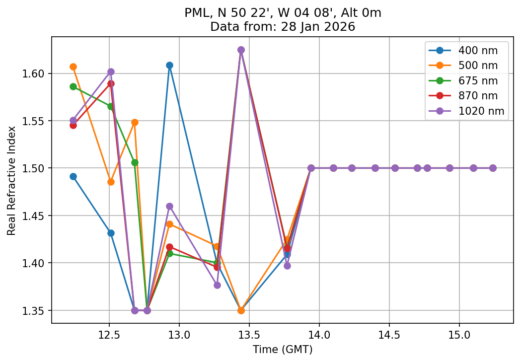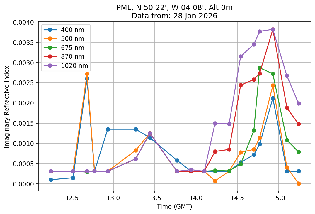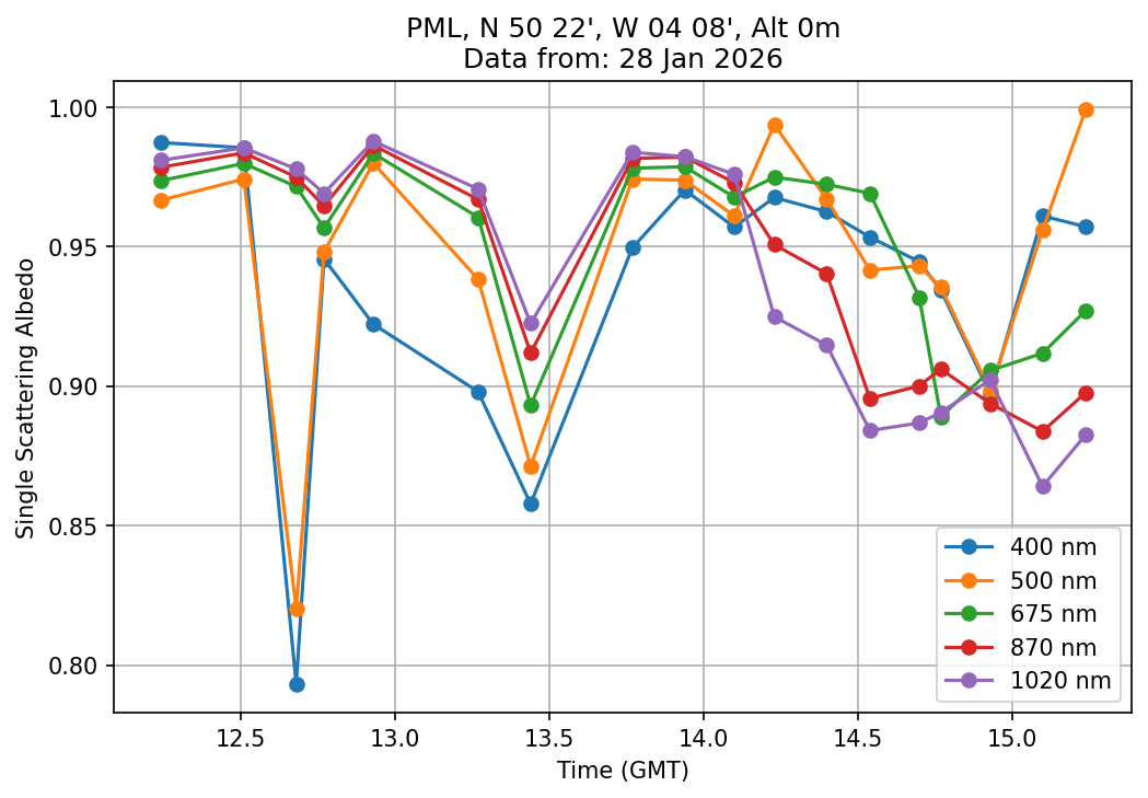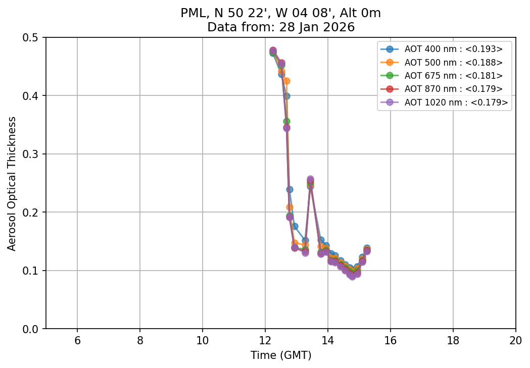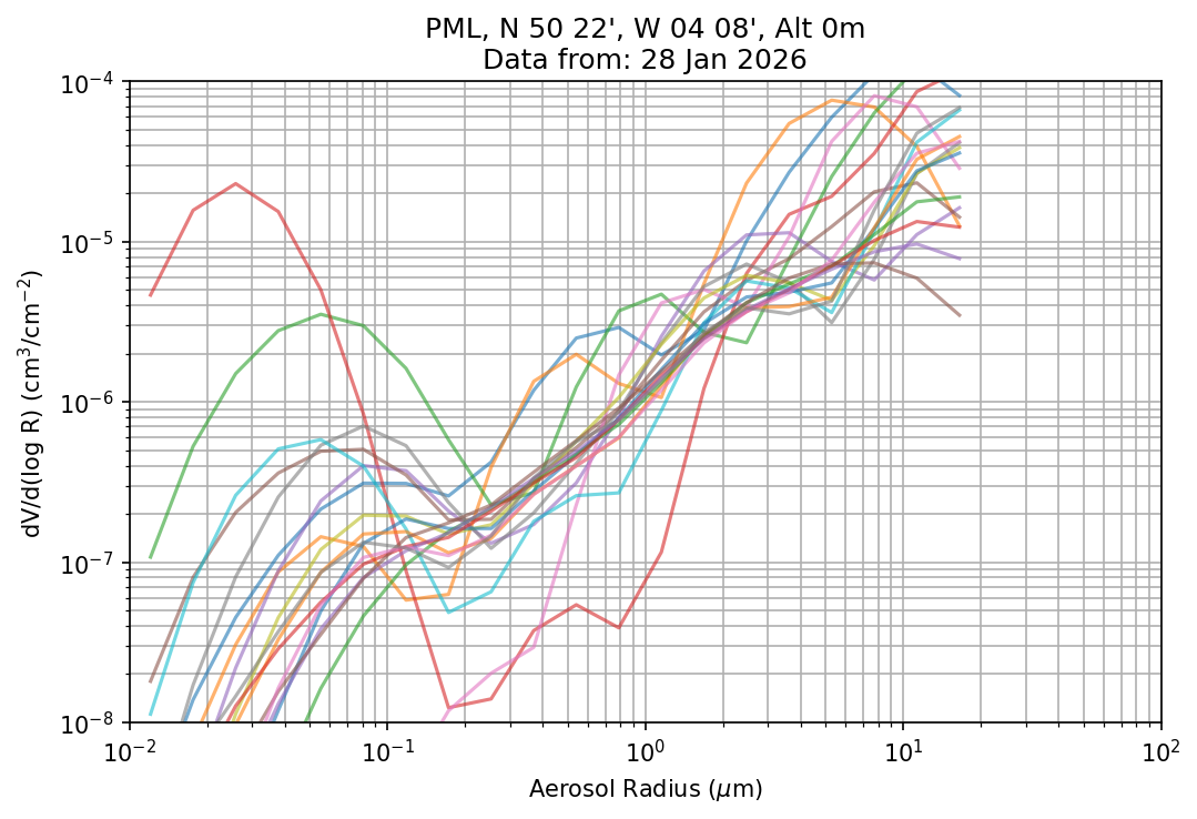 In May 2001 a PREDE POM01-L was installed on the roof of the Plymouth Marine Laboratory to continue the atmospheric correction research of the PML Remote Sensing Group. This was to replace the AERONET CIMEL sunphotometer situated at Rame Head which was decommissioned in 1999. The instrument operates at 7 wavelengths (315, 400, 500, 670, 870, 940 and 1020nm) and scans at pre-set angles away from the solar disk to determine, using the inversion code of Nakajima et al. (2006), various properties of tiny particles called aerosols within the atmospheric column. From these measurements useful atmospheric aerosol parameters such as the Aerosol Optical Thickness (AOT), aerosol size distribution and single scattering albedo can be calculated. Marine aerosols tend to be bigger (D > 1µm) than those generated over the land (0.01 < D < 1µm) and are of a different chemical composition; marine aerosols are salt particles whereas terrestrial aerosols are sulphate compounds.