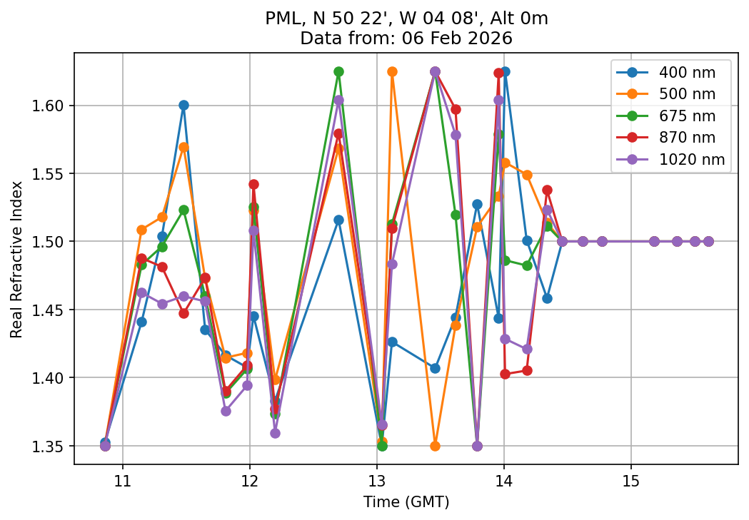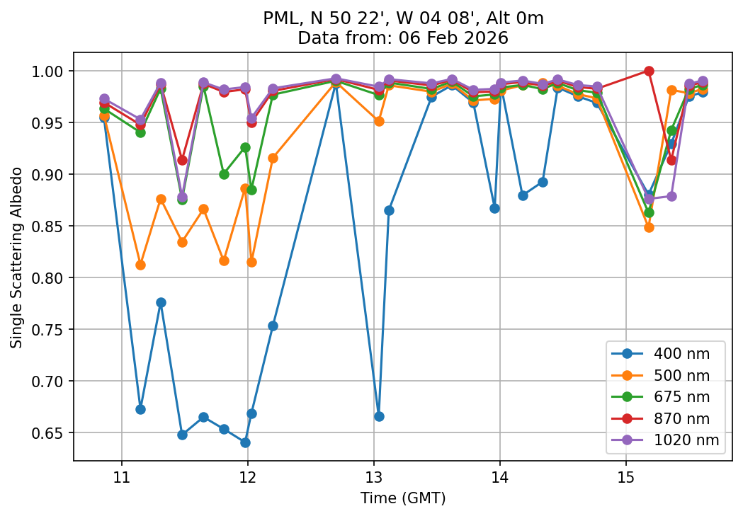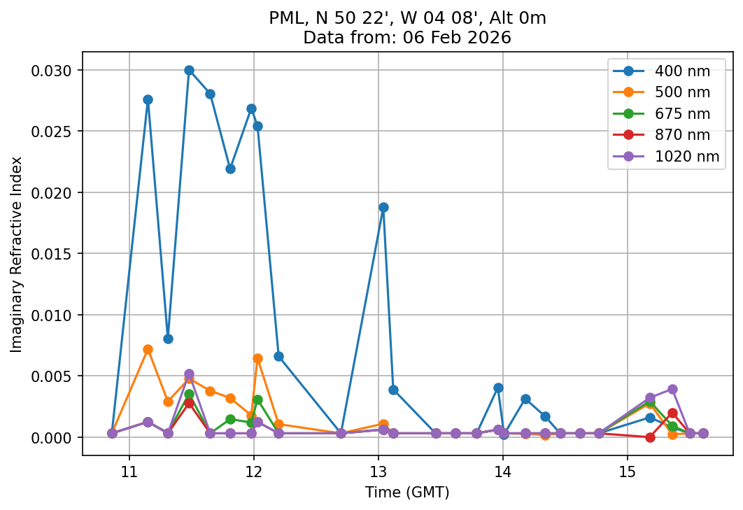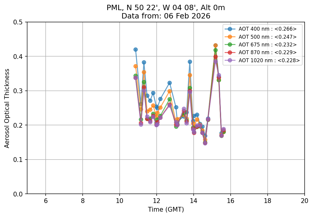 In May 2001 a PREDE POM01-L was installed on the roof of the Plymouth Marine Laboratory to continue the atmospheric correction research of the PML Remote Sensing Group. This was to replace the AERONET CIMEL sunphotometer situated at Rame Head which was decommissioned in 1999. The instrument operates at 7 wavelengths (315, 400, 500, 670, 870, 940 and 1020nm) and scans at pre-set angles away from the solar disk to determine, using the inversion code of Nakajima et al. (2006), various properties of tiny particles called aerosols within the atmospheric column. From these measurements useful atmospheric aerosol parameters such as the Aerosol Optical Thickness (AOT), aerosol size distribution and single scattering albedo can be calculated. Marine aerosols tend to be bigger (D > 1µm) than those generated over the land (0.01 < D < 1µm) and are of a different chemical composition; marine aerosols are salt particles whereas terrestrial aerosols are sulphate compounds.