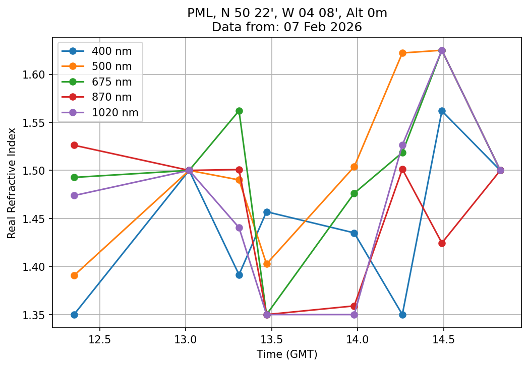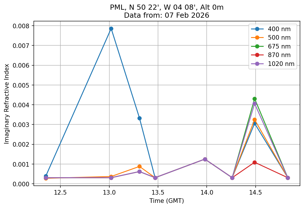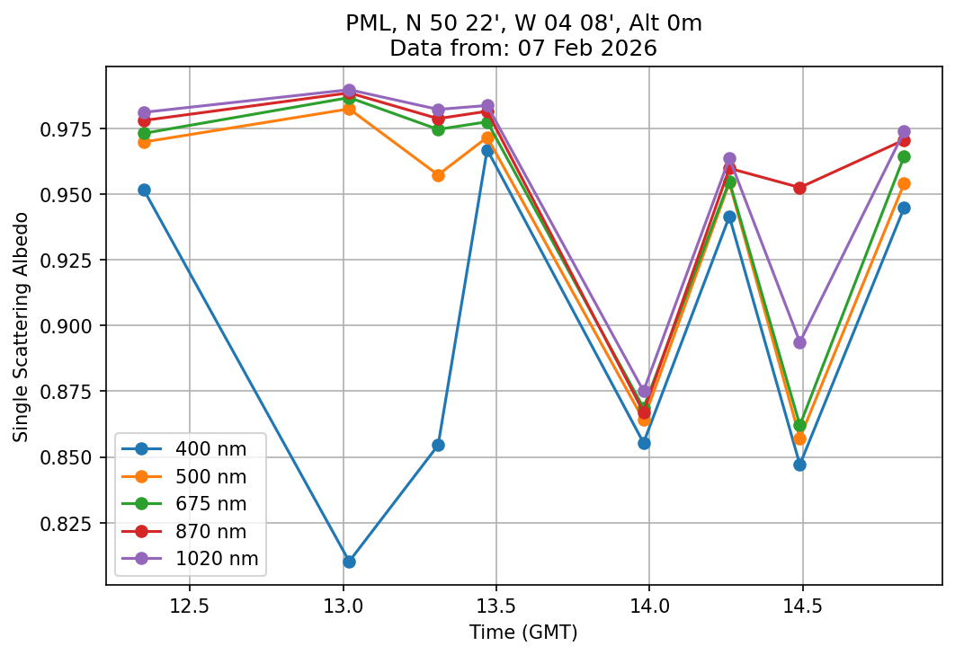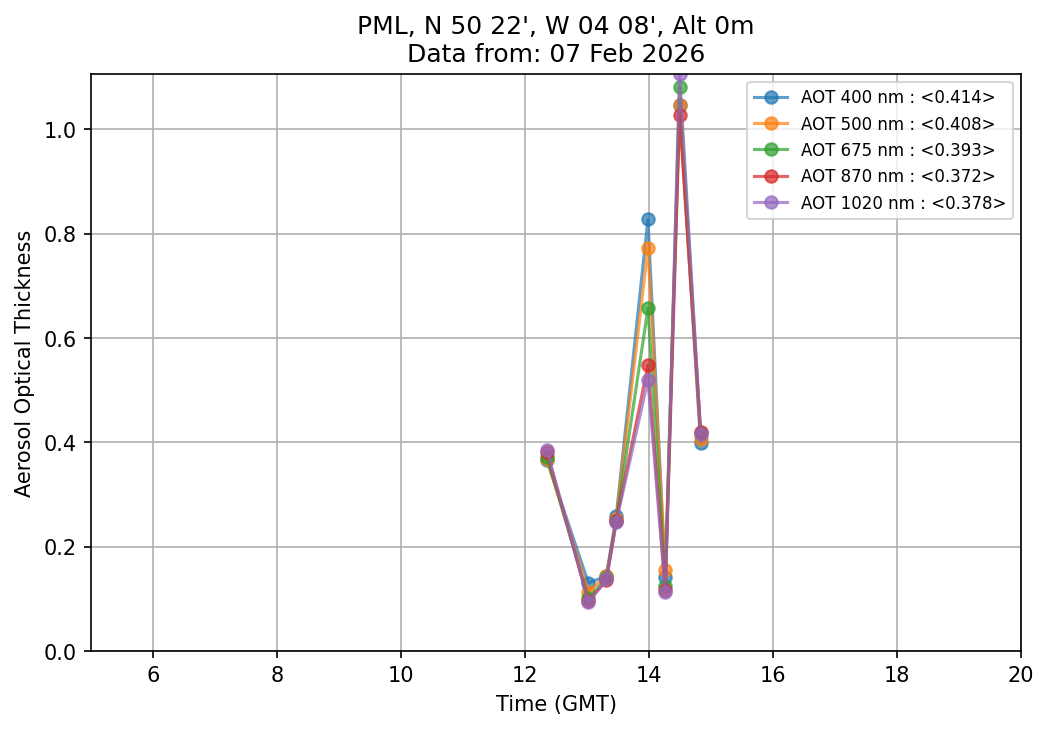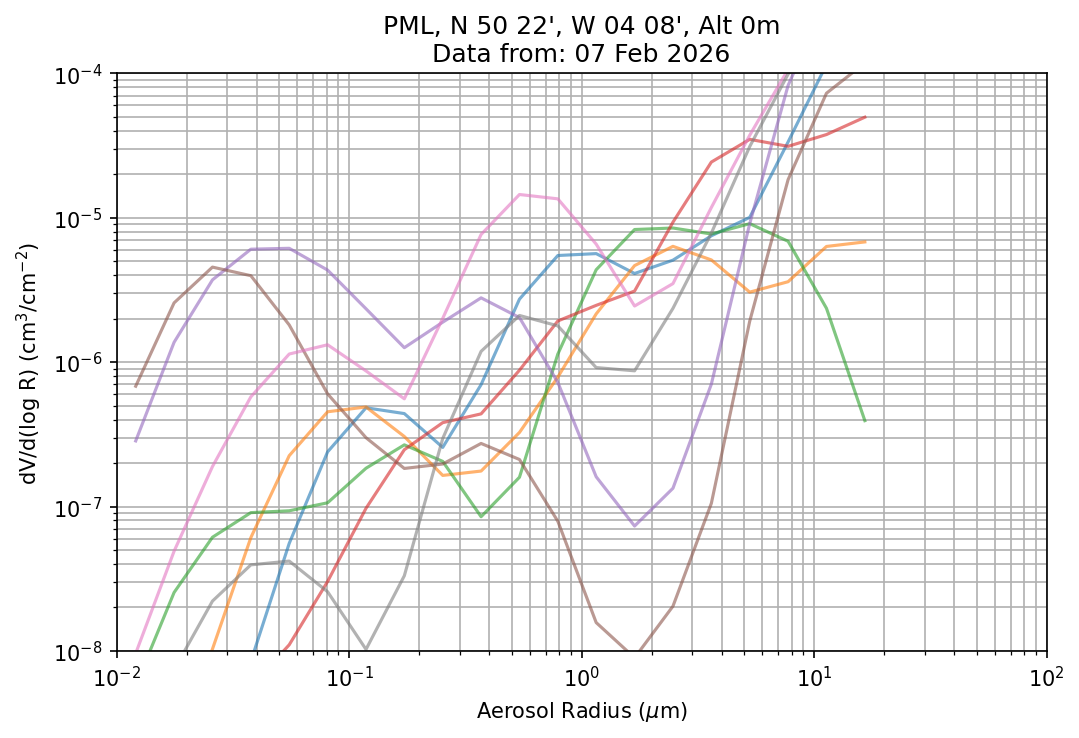 In May 2001 a PREDE POM01-L was installed on the roof of the Plymouth Marine Laboratory to continue the atmospheric correction research of the PML Remote Sensing Group. This was to replace the AERONET CIMEL sunphotometer situated at Rame Head which was decommissioned in 1999. The instrument operates at 7 wavelengths (315, 400, 500, 670, 870, 940 and 1020nm) and scans at pre-set angles away from the solar disk to determine, using the inversion code of Nakajima et al. (2006), various properties of tiny particles called aerosols within the atmospheric column. From these measurements useful atmospheric aerosol parameters such as the Aerosol Optical Thickness (AOT), aerosol size distribution and single scattering albedo can be calculated. Marine aerosols tend to be bigger (D > 1µm) than those generated over the land (0.01 < D < 1µm) and are of a different chemical composition; marine aerosols are salt particles whereas terrestrial aerosols are sulphate compounds.