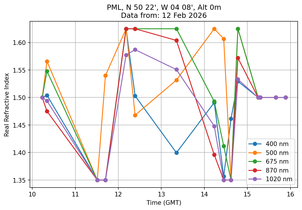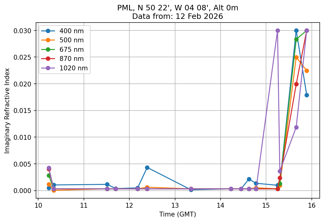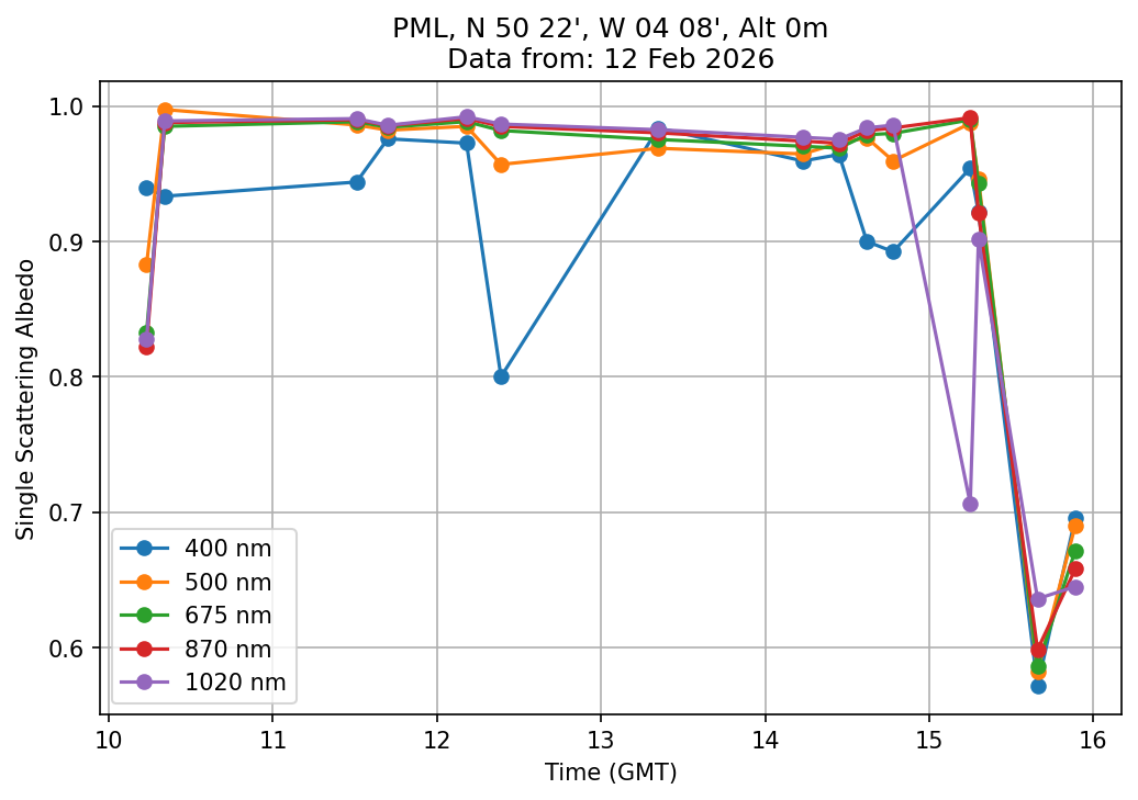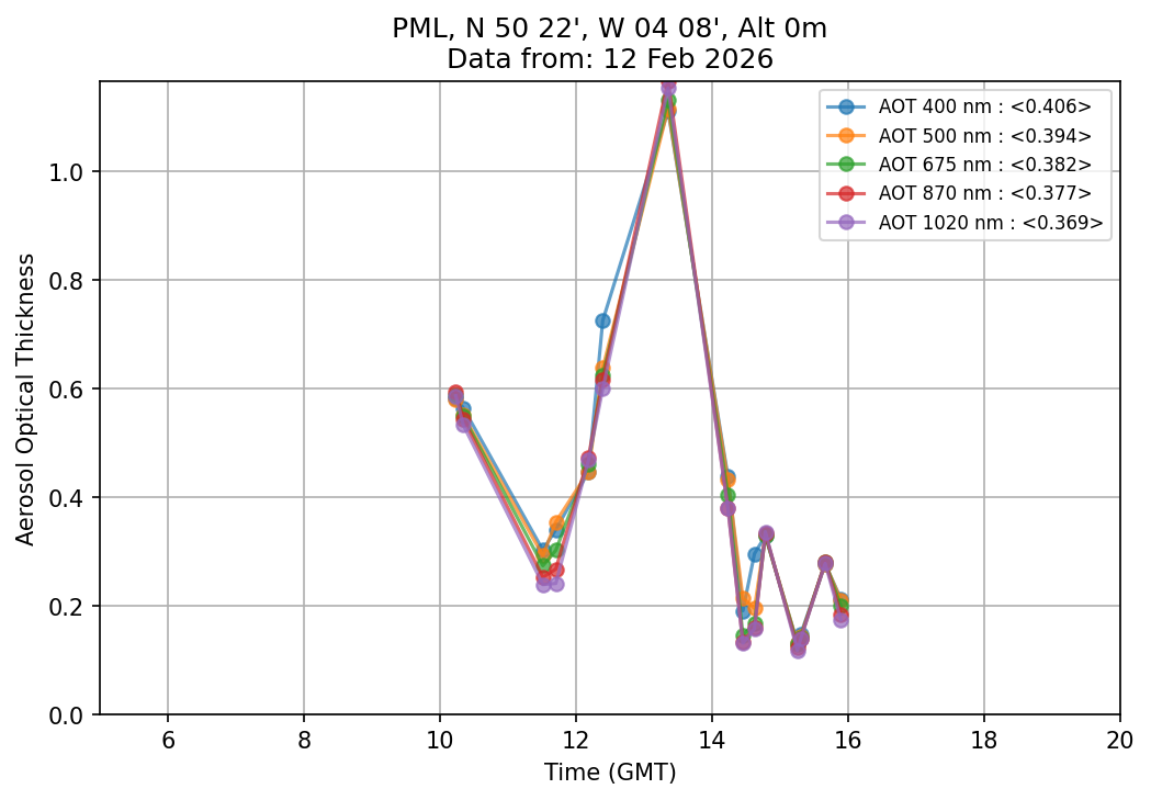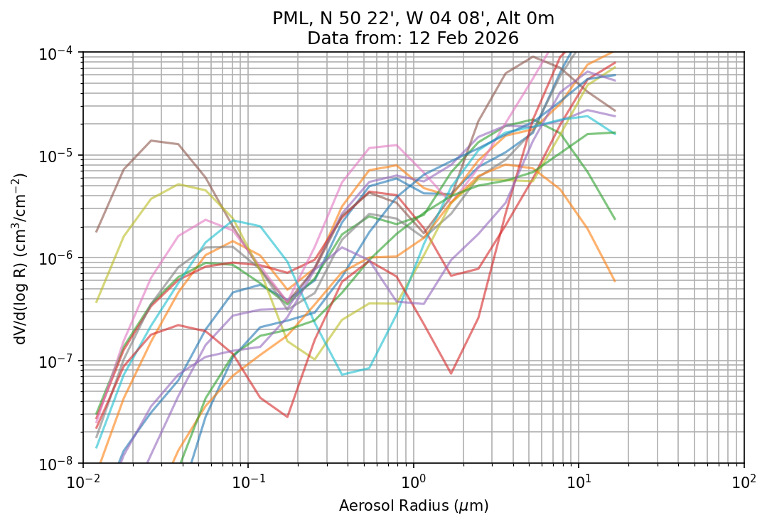 In May 2001 a PREDE POM01-L was installed on the roof of the Plymouth Marine Laboratory to continue the atmospheric correction research of the PML Remote Sensing Group. This was to replace the AERONET CIMEL sunphotometer situated at Rame Head which was decommissioned in 1999. The instrument operates at 7 wavelengths (315, 400, 500, 670, 870, 940 and 1020nm) and scans at pre-set angles away from the solar disk to determine, using the inversion code of Nakajima et al. (2006), various properties of tiny particles called aerosols within the atmospheric column. From these measurements useful atmospheric aerosol parameters such as the Aerosol Optical Thickness (AOT), aerosol size distribution and single scattering albedo can be calculated. Marine aerosols tend to be bigger (D > 1µm) than those generated over the land (0.01 < D < 1µm) and are of a different chemical composition; marine aerosols are salt particles whereas terrestrial aerosols are sulphate compounds.