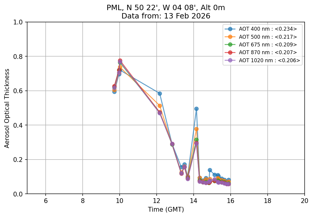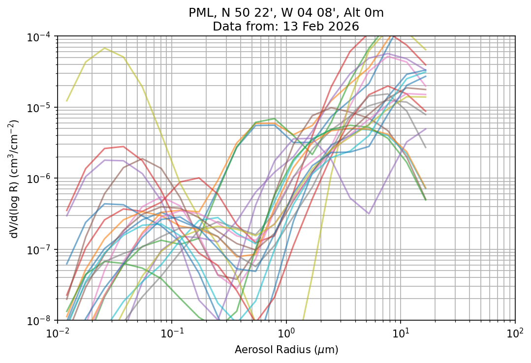 In May 2001 a PREDE POM01-L was installed on the roof of the Plymouth Marine Laboratory to continue the atmospheric correction research of the PML Remote Sensing Group. This was to replace the AERONET CIMEL sunphotometer situated at Rame Head which was decommissioned in 1999. The instrument operates at 7 wavelengths (315, 400, 500, 670, 870, 940 and 1020nm) and scans at pre-set angles away from the solar disk to determine, using the inversion code of Nakajima et al. (2006), various properties of tiny particles called aerosols within the atmospheric column. From these measurements useful atmospheric aerosol parameters such as the Aerosol Optical Thickness (AOT), aerosol size distribution and single scattering albedo can be calculated. Marine aerosols tend to be bigger (D > 1µm) than those generated over the land (0.01 < D < 1µm) and are of a different chemical composition; marine aerosols are salt particles whereas terrestrial aerosols are sulphate compounds.