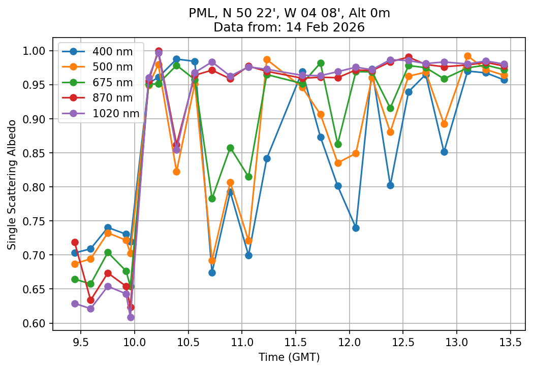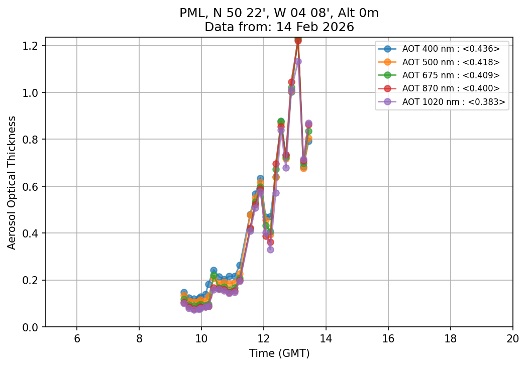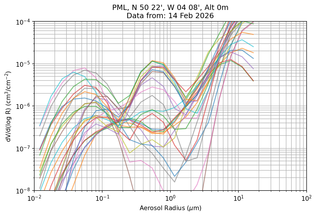 In May 2001 a PREDE POM01-L was installed on the roof of the Plymouth Marine Laboratory to continue the atmospheric correction research of the PML Remote Sensing Group. This was to replace the AERONET CIMEL sunphotometer situated at Rame Head which was decommissioned in 1999. The instrument operates at 7 wavelengths (315, 400, 500, 670, 870, 940 and 1020nm) and scans at pre-set angles away from the solar disk to determine, using the inversion code of Nakajima et al. (2006), various properties of tiny particles called aerosols within the atmospheric column. From these measurements useful atmospheric aerosol parameters such as the Aerosol Optical Thickness (AOT), aerosol size distribution and single scattering albedo can be calculated. Marine aerosols tend to be bigger (D > 1µm) than those generated over the land (0.01 < D < 1µm) and are of a different chemical composition; marine aerosols are salt particles whereas terrestrial aerosols are sulphate compounds.