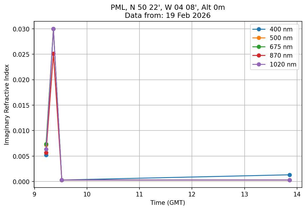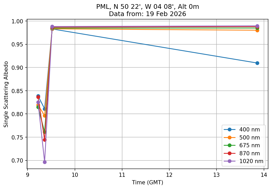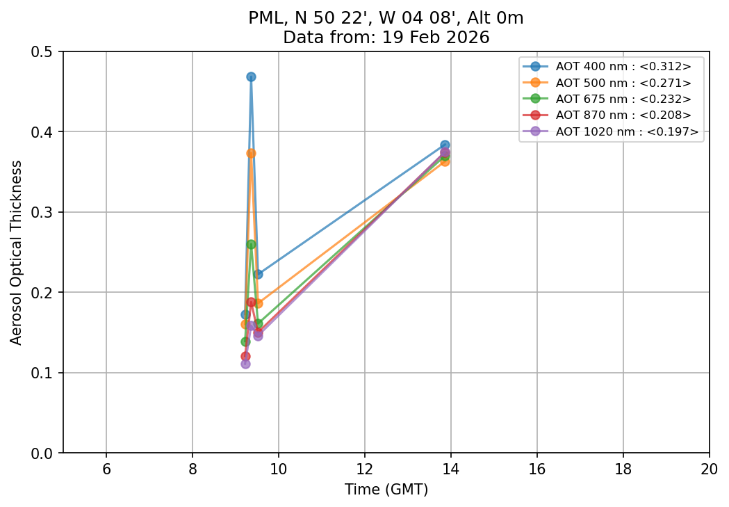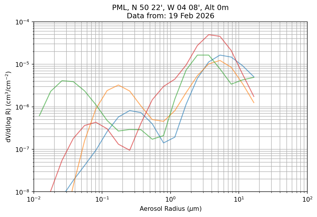 In May 2001 a PREDE POM01-L was installed on the roof of the Plymouth Marine Laboratory to continue the atmospheric correction research of the PML Remote Sensing Group. This was to replace the AERONET CIMEL sunphotometer situated at Rame Head which was decommissioned in 1999. The instrument operates at 7 wavelengths (315, 400, 500, 670, 870, 940 and 1020nm) and scans at pre-set angles away from the solar disk to determine, using the inversion code of Nakajima et al. (2006), various properties of tiny particles called aerosols within the atmospheric column. From these measurements useful atmospheric aerosol parameters such as the Aerosol Optical Thickness (AOT), aerosol size distribution and single scattering albedo can be calculated. Marine aerosols tend to be bigger (D > 1µm) than those generated over the land (0.01 < D < 1µm) and are of a different chemical composition; marine aerosols are salt particles whereas terrestrial aerosols are sulphate compounds.