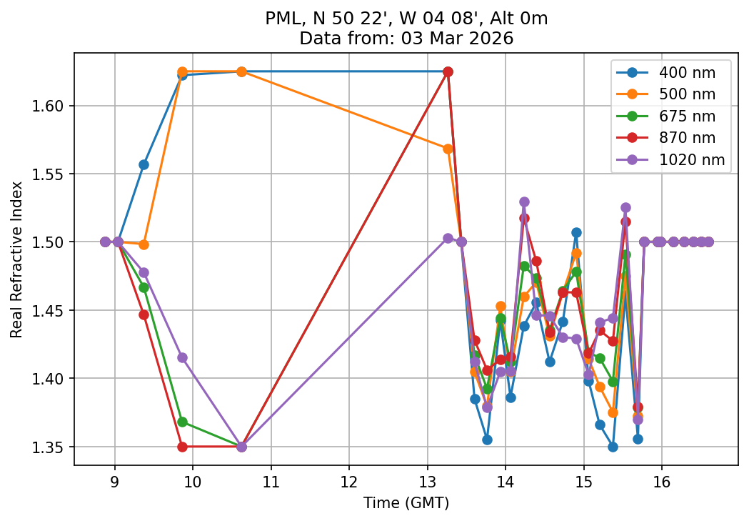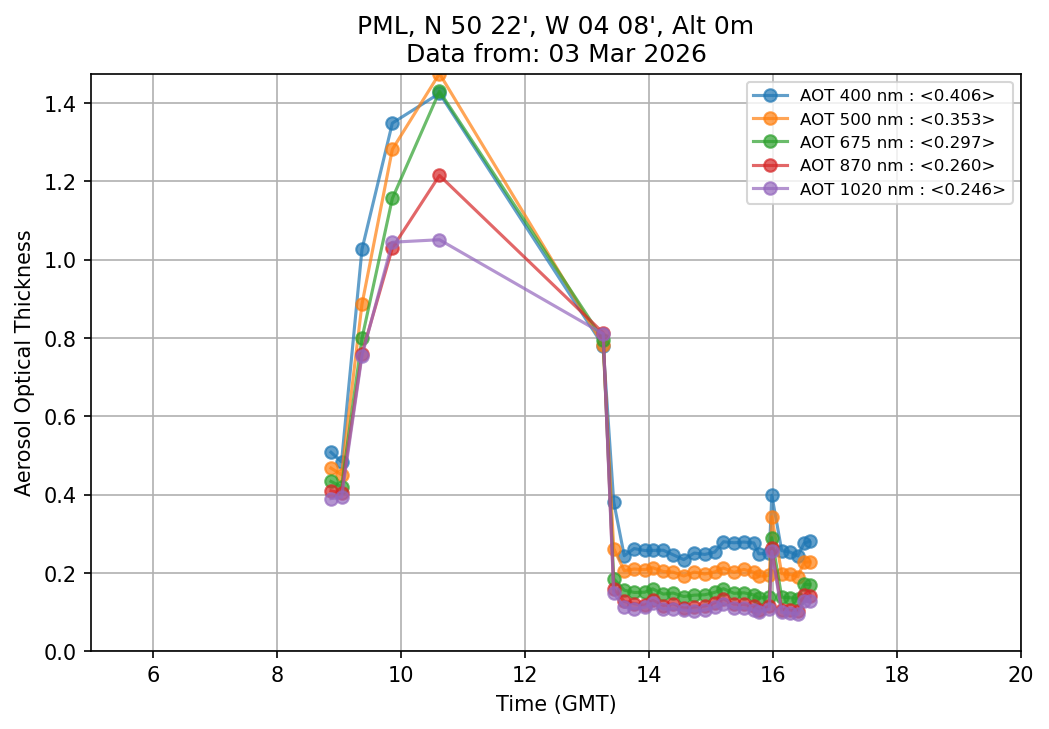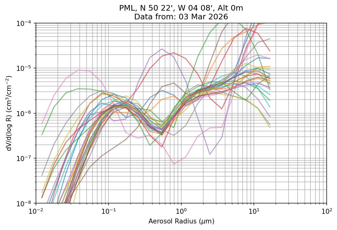 In May 2001 a PREDE POM01-L was installed on the roof of the Plymouth Marine Laboratory to continue the atmospheric correction research of the PML Remote Sensing Group. This was to replace the AERONET CIMEL sunphotometer situated at Rame Head which was decommissioned in 1999. The instrument operates at 7 wavelengths (315, 400, 500, 670, 870, 940 and 1020nm) and scans at pre-set angles away from the solar disk to determine, using the inversion code of Nakajima et al. (2006), various properties of tiny particles called aerosols within the atmospheric column. From these measurements useful atmospheric aerosol parameters such as the Aerosol Optical Thickness (AOT), aerosol size distribution and single scattering albedo can be calculated. Marine aerosols tend to be bigger (D > 1µm) than those generated over the land (0.01 < D < 1µm) and are of a different chemical composition; marine aerosols are salt particles whereas terrestrial aerosols are sulphate compounds.