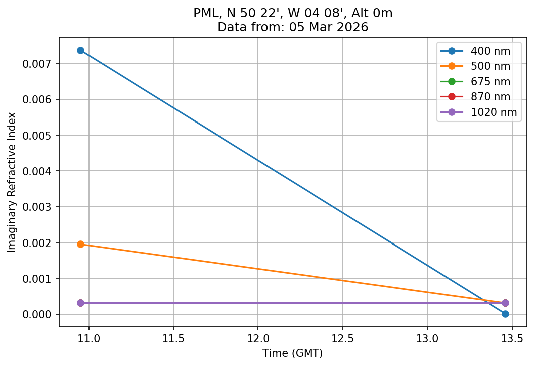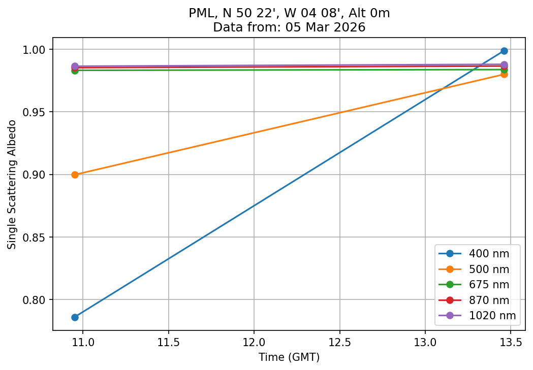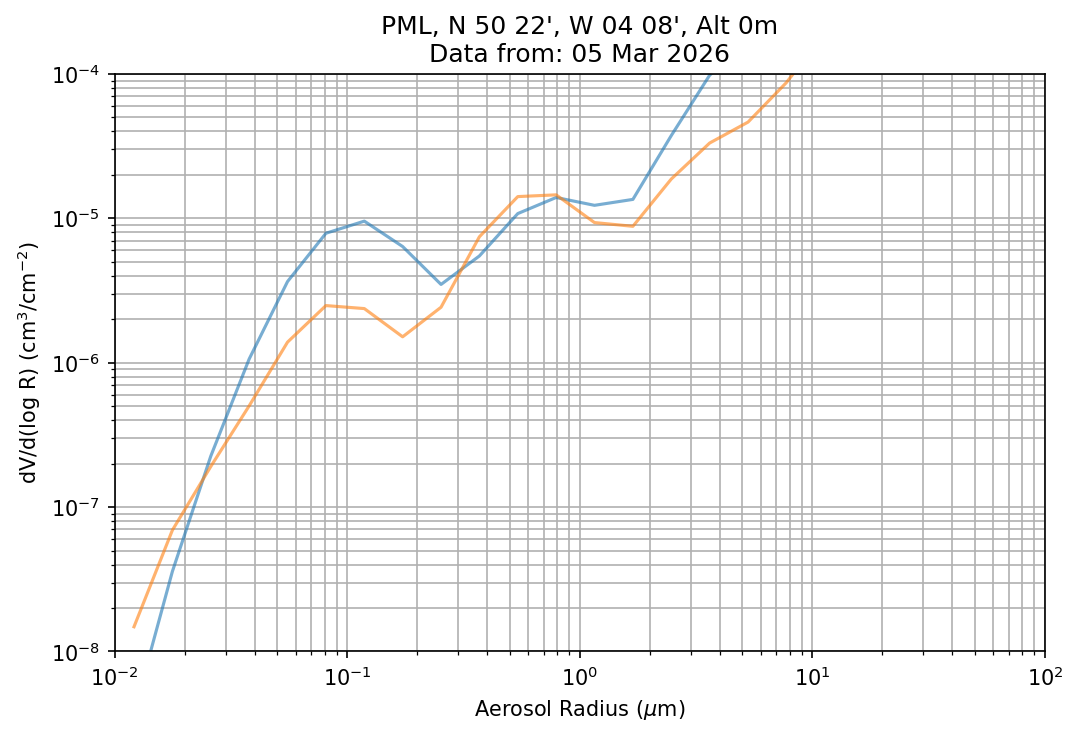 In May 2001 a PREDE POM01-L was installed on the roof of the Plymouth Marine Laboratory to continue the atmospheric correction research of the PML Remote Sensing Group. This was to replace the AERONET CIMEL sunphotometer situated at Rame Head which was decommissioned in 1999. The instrument operates at 7 wavelengths (315, 400, 500, 670, 870, 940 and 1020nm) and scans at pre-set angles away from the solar disk to determine, using the inversion code of Nakajima et al. (2006), various properties of tiny particles called aerosols within the atmospheric column. From these measurements useful atmospheric aerosol parameters such as the Aerosol Optical Thickness (AOT), aerosol size distribution and single scattering albedo can be calculated. Marine aerosols tend to be bigger (D > 1µm) than those generated over the land (0.01 < D < 1µm) and are of a different chemical composition; marine aerosols are salt particles whereas terrestrial aerosols are sulphate compounds.
