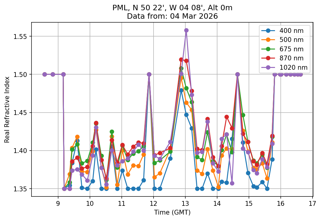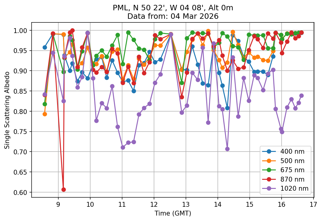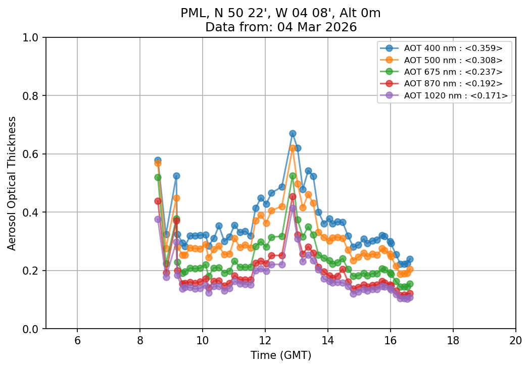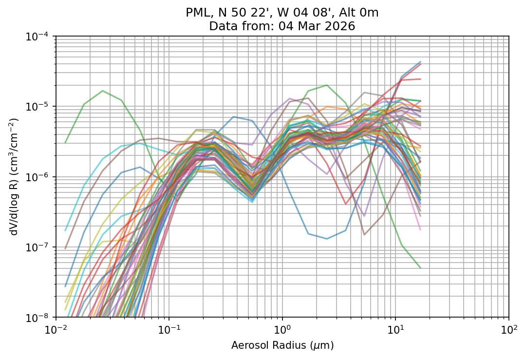 In May 2001 a PREDE POM01-L was installed on the roof of the Plymouth Marine Laboratory to continue the atmospheric correction research of the PML Remote Sensing Group. This was to replace the AERONET CIMEL sunphotometer situated at Rame Head which was decommissioned in 1999. The instrument operates at 7 wavelengths (315, 400, 500, 670, 870, 940 and 1020nm) and scans at pre-set angles away from the solar disk to determine, using the inversion code of Nakajima et al. (2006), various properties of tiny particles called aerosols within the atmospheric column. From these measurements useful atmospheric aerosol parameters such as the Aerosol Optical Thickness (AOT), aerosol size distribution and single scattering albedo can be calculated. Marine aerosols tend to be bigger (D > 1µm) than those generated over the land (0.01 < D < 1µm) and are of a different chemical composition; marine aerosols are salt particles whereas terrestrial aerosols are sulphate compounds.